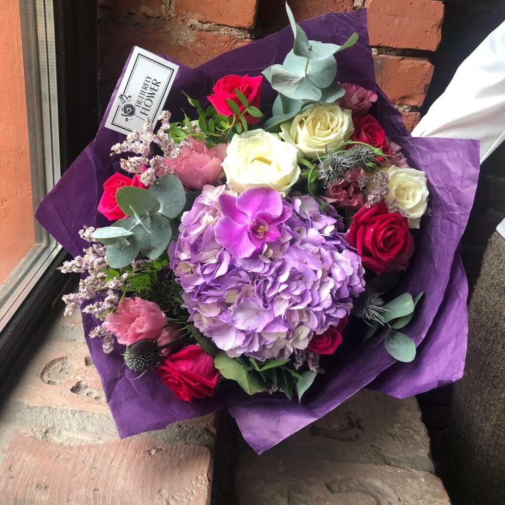 Букет из гортензии, эригниума, лизиантуса и роз “Сердце весны”