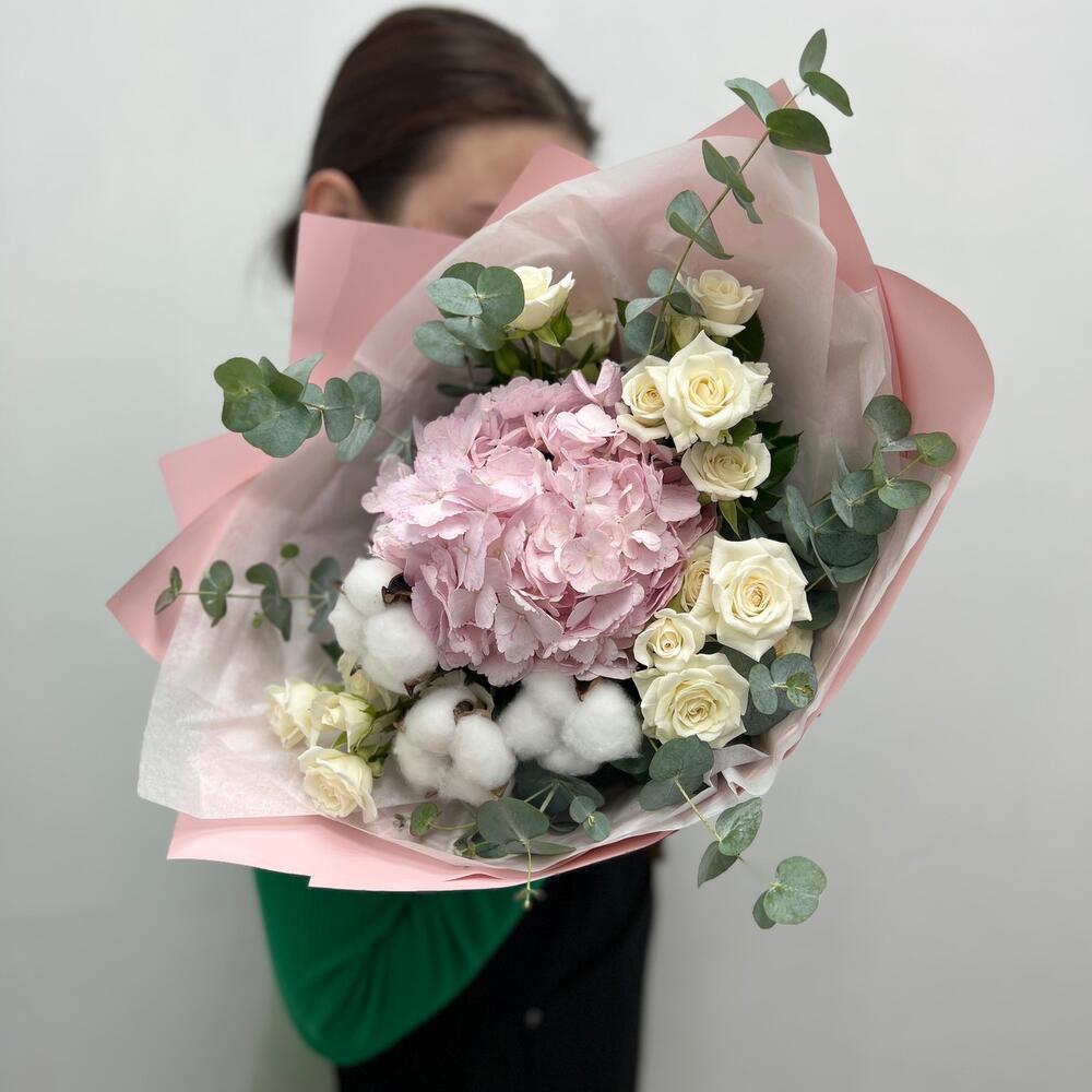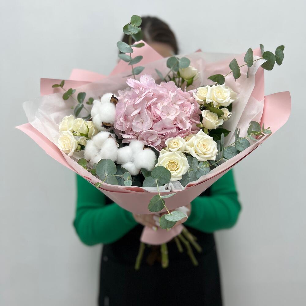 Гортензия – 1 шт.Хлопок – 3 шт.Кустовая роза – 5 шт.Упаковка дизайнерская – 1 шт.эвкалипт ветка – 3 шт.