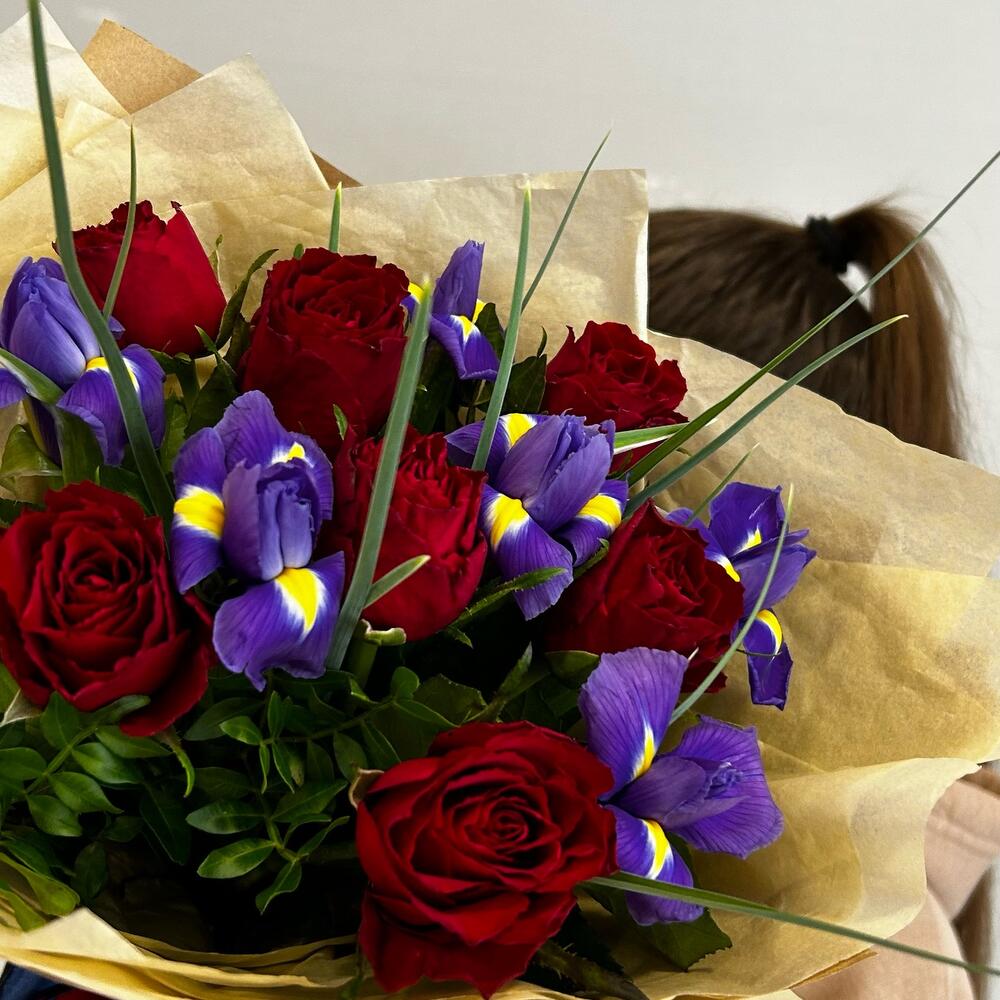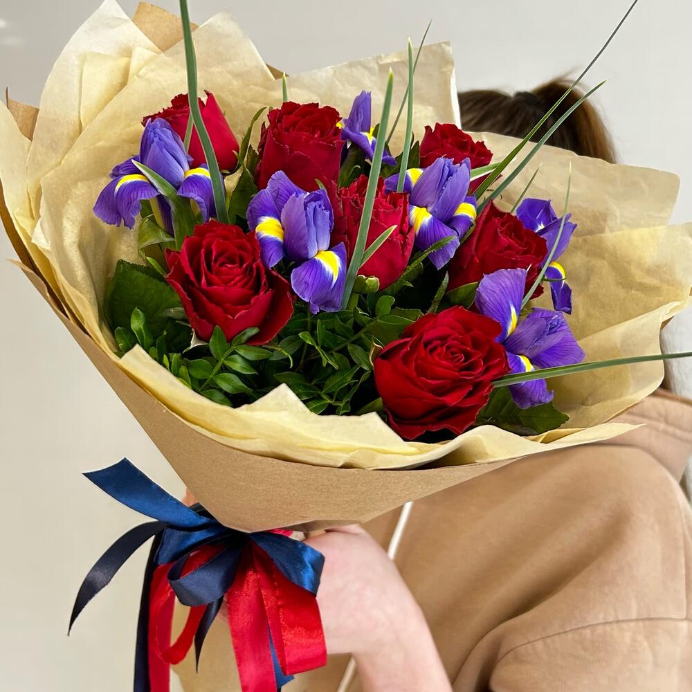Роза – 7 шт.Ирис – 9 шт.Упаковка дизайнерская – 2 шт.Лента атласная – 2 шт.
