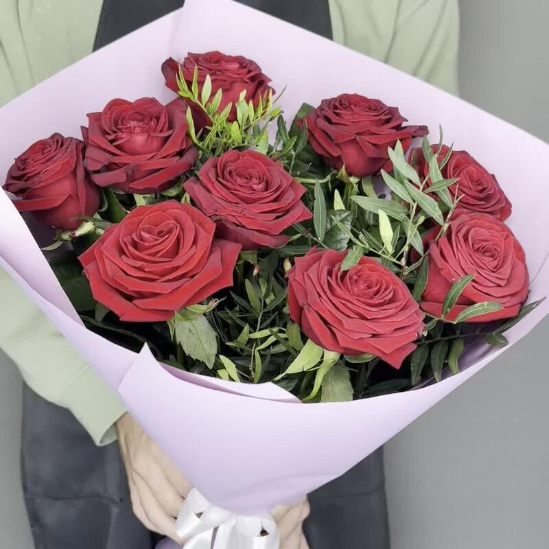Букет из красных роз с зеленью