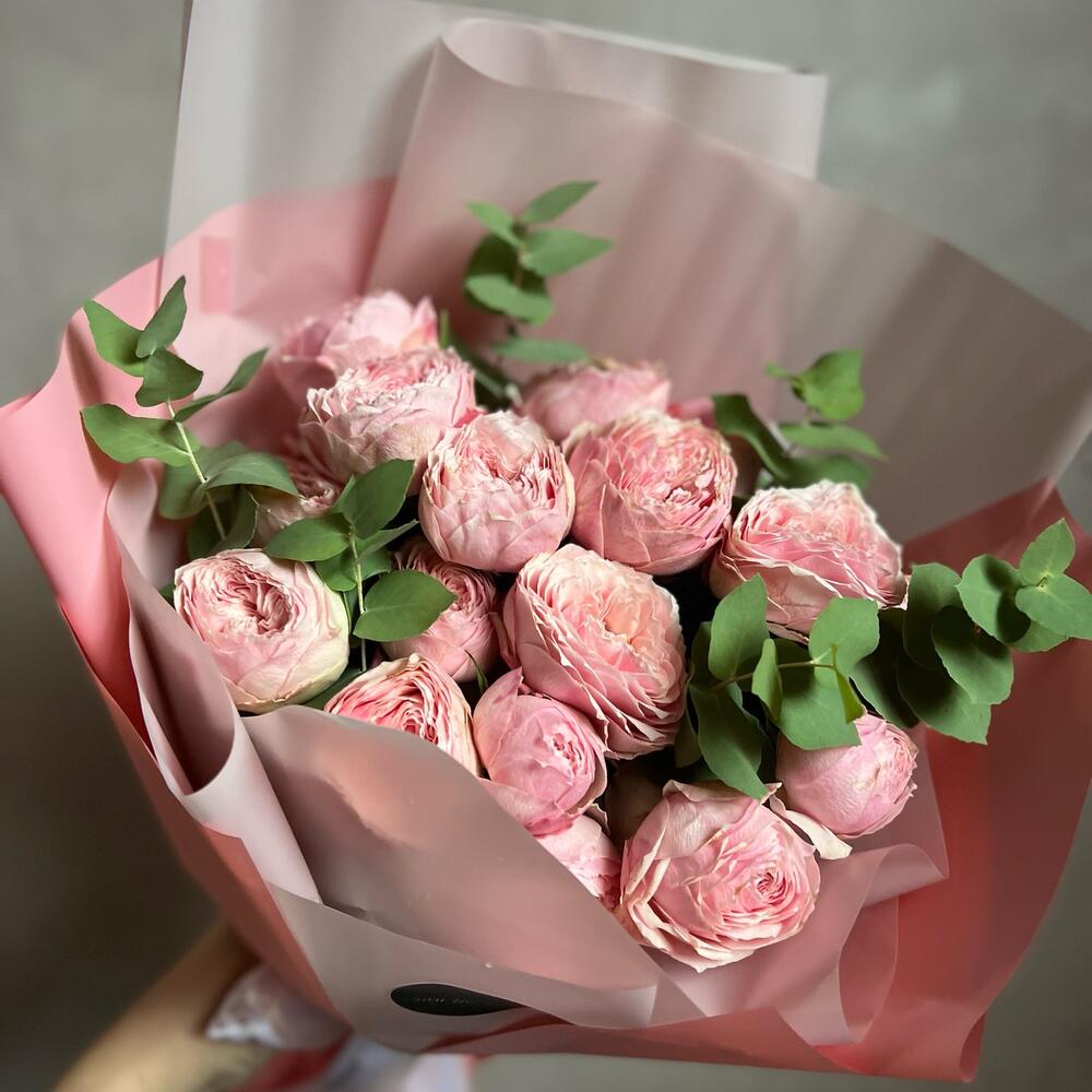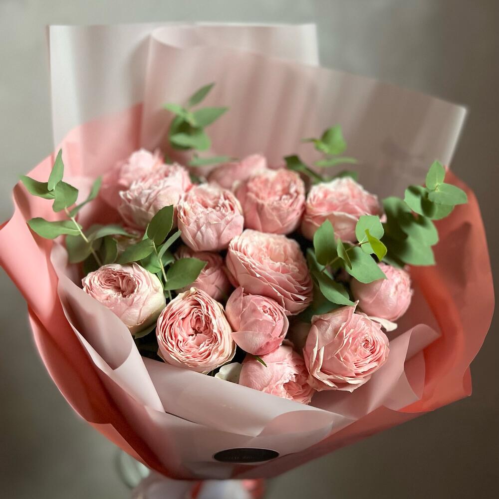 Кустовая пионовидная роза – 5 шт.Эвкалипт – 3 шт.декоративная упаковка – 1 шт.Атласная лента – 1 шт.
