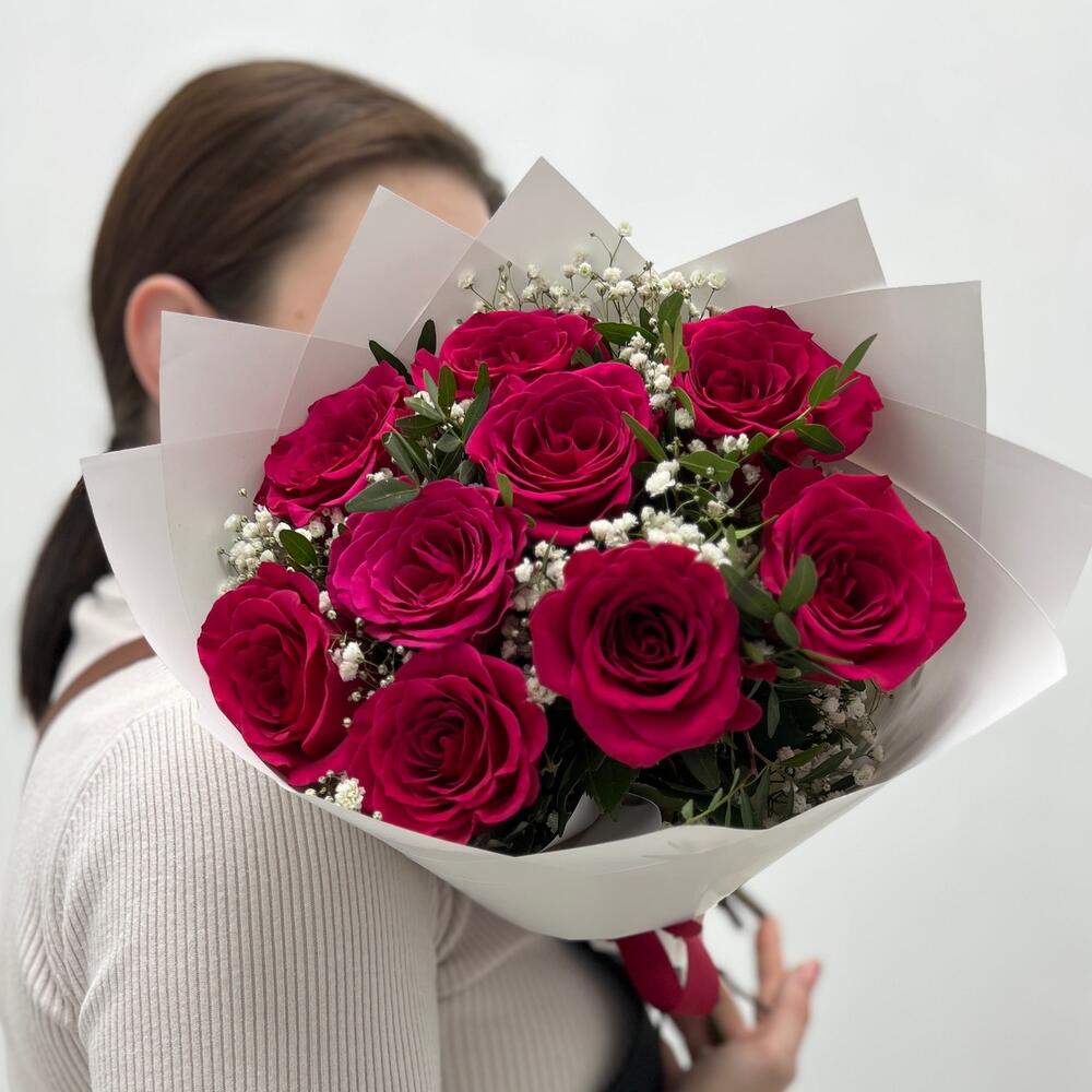 Гипсофила – 2 шт.Роза – 9 шт.Упаковка дизайнерская – 1 шт.