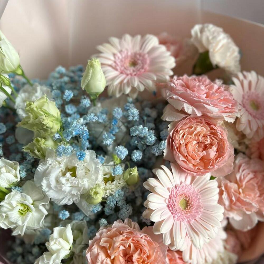Маттиола белая – 2 шт.Гипсофила голубая – 2 шт.Лизиантус белый – 3 шт.Гербера розовая – 5 шт.пионовидная кустовая роза джульетта – 2 шт.гипсофила белая – 1 шт.Кустовая роза bombastic – 1 шт.Диантус белый – 3 шт.Дизайнерская упаковка – 3 шт.Атласная лента – 2 шт.открытка с правилами ухода за свежими цветами – 1 шт.подкормка для цветов – 1 шт.Транспортировочная коробка – 1 шт.