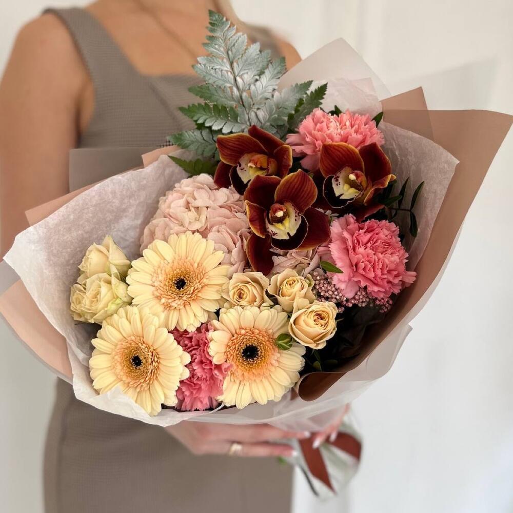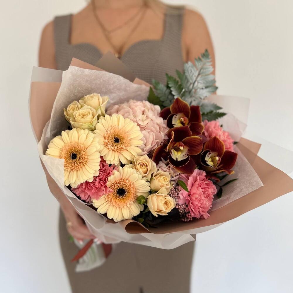 Гортензия – 1 шт.Озотамнус – 1 шт.Папоротник – 1 шт.Роза кустовая – 2 шт.Гербера – 3 шт.Диантус – 3 шт.орхидея – 3 шт.Дизайнерская упаковка – 3 шт.