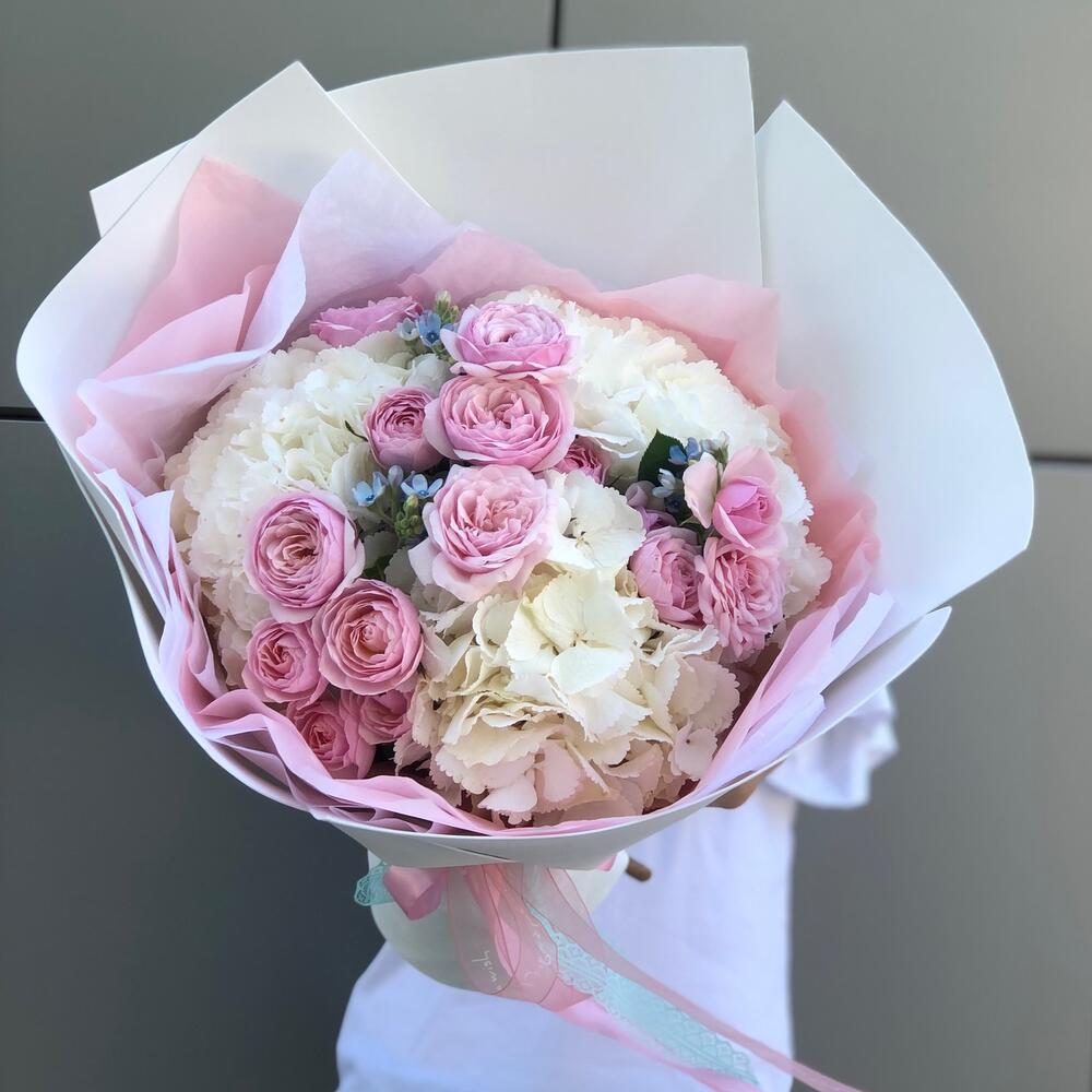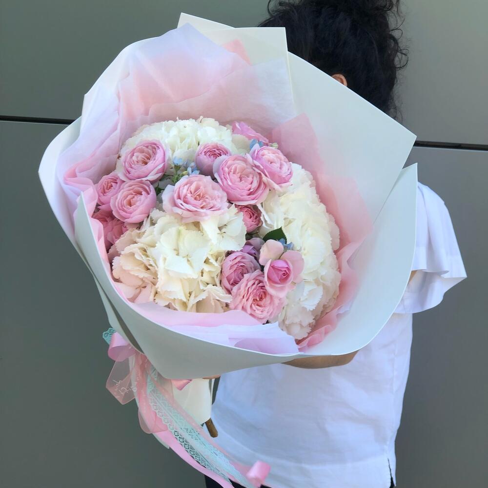 Букет из пионовидной розы, гортензии и оксипеталума «Нежность»