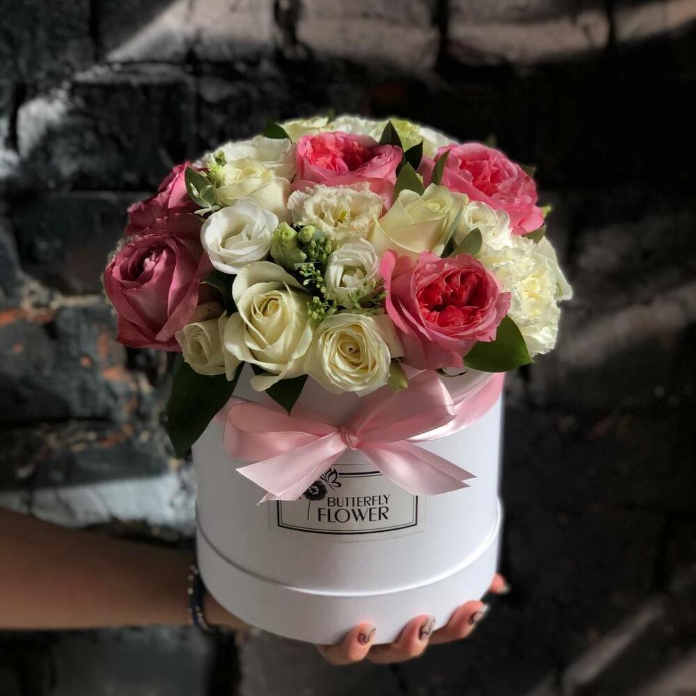 Шляпная коробка – 1 шт.Оазис – 1 шт.Роза пионовидная – 7 шт.Роза белая – 4 шт.Диантус – 4 шт.Эустома – 4 шт.Седум – 2 шт.Эвкалипт – 2 шт.Рускус – 2 шт.