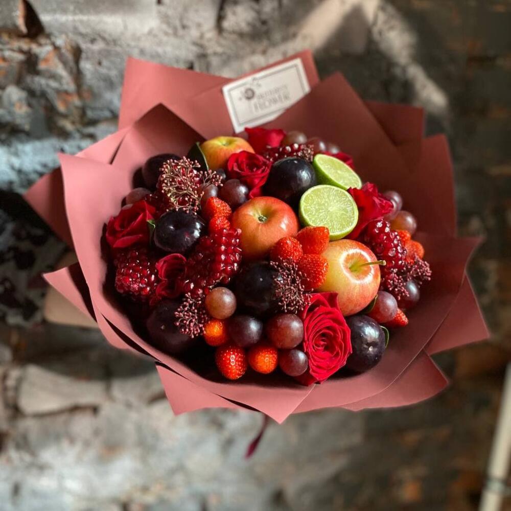 Клубника – 200 гр.Роза – 7 шт.Упаковка – 2 шт.Виноград – 250 гр.Гранат – 1 шт.Яблоко – 3 шт.Скиммия – 3 шт.Лайм – 1 шт.Слива – 7 шт.