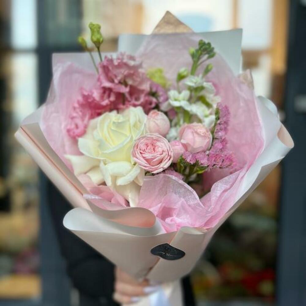 Маттиола – 1 шт.Статица – 1 шт.Кустовая пионовидная роза – 1 шт.Одноголовая роза – 1 шт.декоративная упаковка – 1 шт.Атласная лента – 1 шт.