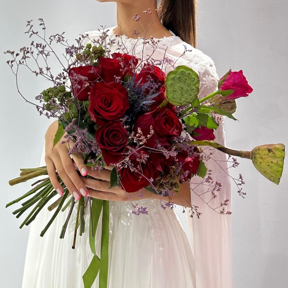 Букет состоит из лотоса и роз. Лотос символизирует чистоту и духовное просветление своими нежными лепестками и уникальной формой, а розы приносят романтику и красоту своими изящными цветами. Это сочетание создает букет, который воплощает гармонию и элегантность, принося радость и восхищение своей утонченностью.