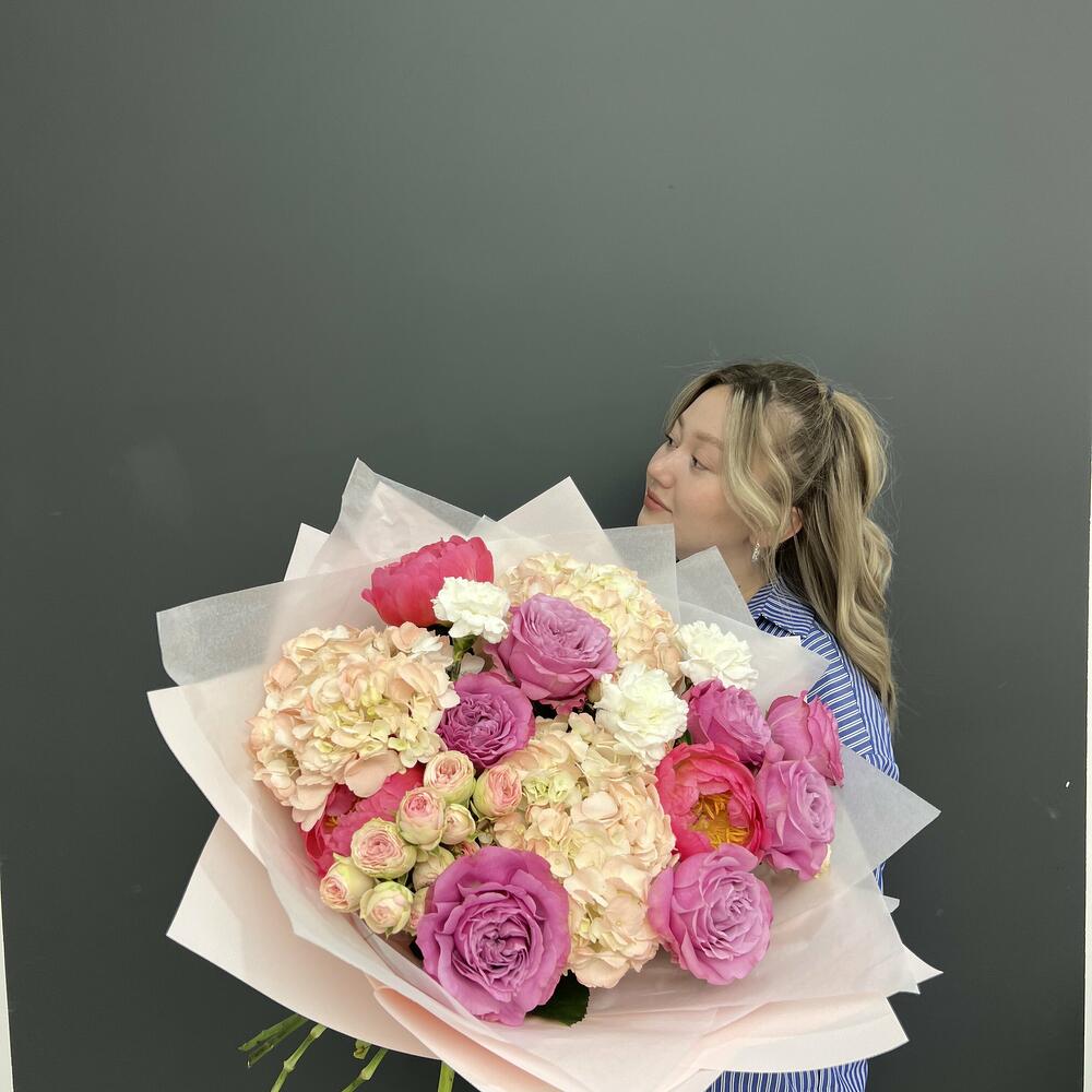 Альстромерии, Кустовые розы, Лизиантусы, Пионовидные розы, Розы, Ромашки