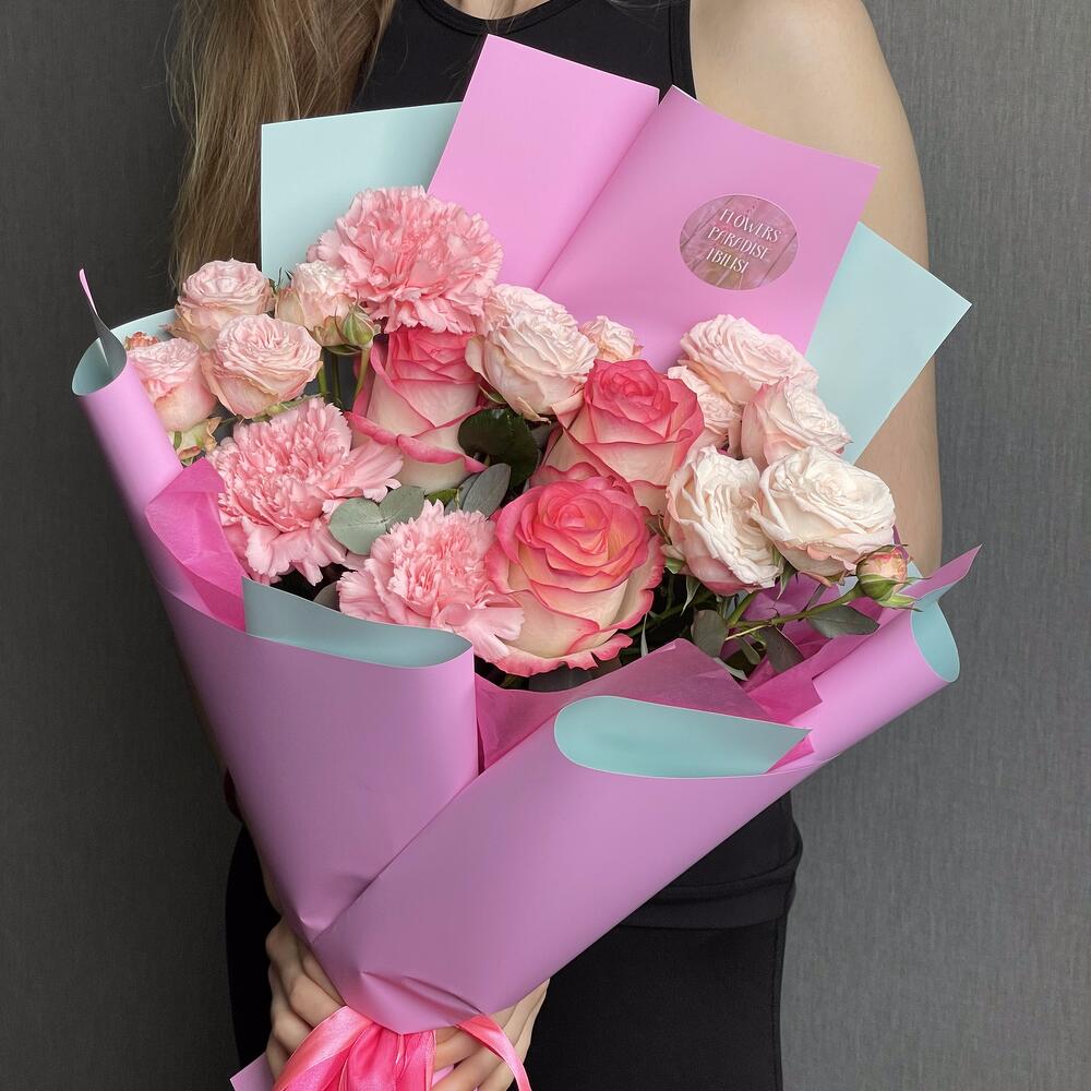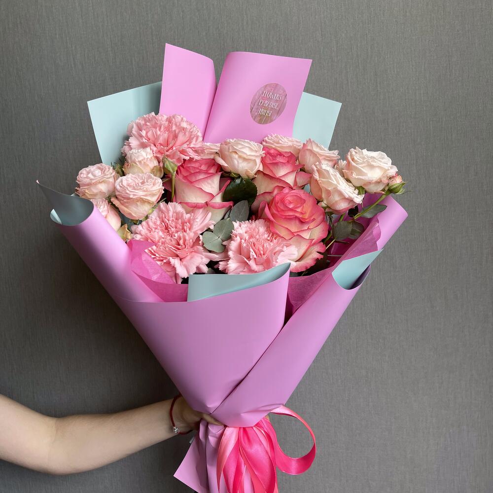 В композиции использованы разные сорта роз и диантусов, чтобы создать уникальное сочетание цветов и текстур.