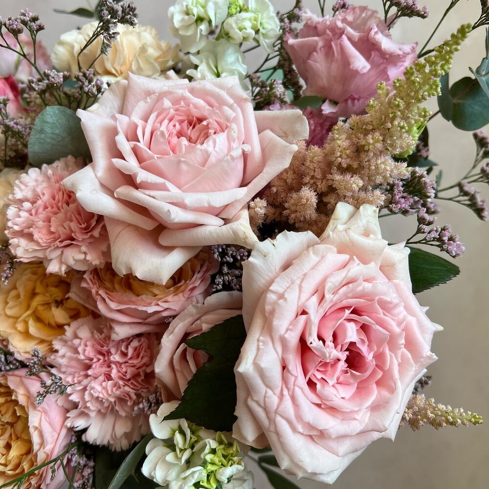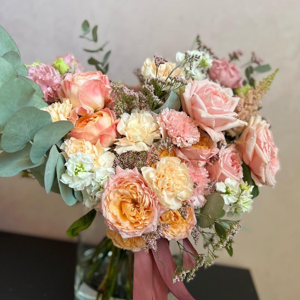 Кустовая пионовидная роза – 1 шт.Пионовидная одноголовая роза – 5 шт.садовая роза aiko – 2 шт.Диантус – 10 шт.Маттиола – 5 шт.Лизиантус (эустома) – 3 шт.Амми – 2 шт.Астильба – 3 шт.Хамелациум – 1 шт.Лимониум – 3 шт.Эвкалипт – 3 шт.Атласная лента – 2 шт.