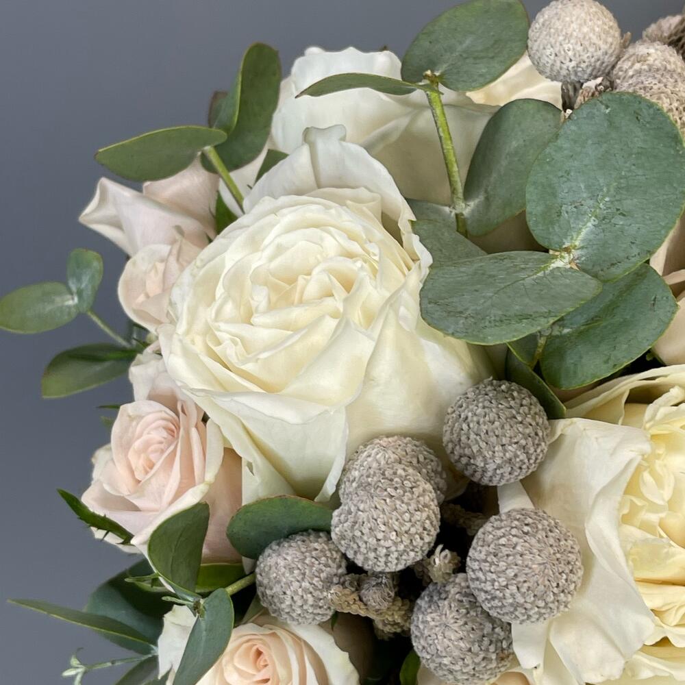 Бруния – 2 шт.Лента – 2 шт.Роза кустовая – 3 шт.Эвкалипт – 2 шт.Роза одноголовая – 5 шт.Транспортировочная коробка – 1 шт.