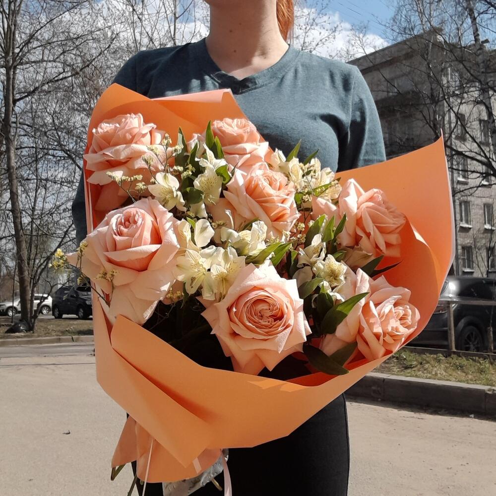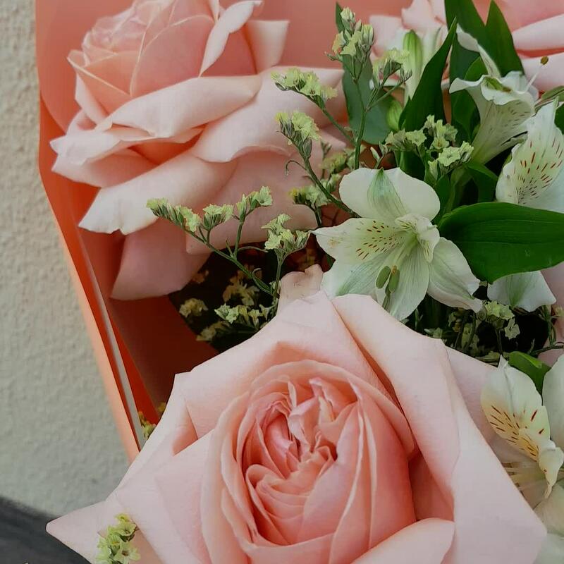 Альстромерия – 6 шт.Лимониум – 3 шт.Лента атласная – 2 шт.Упаковка дизайнерская – 3 шт.Роза французская – 7 шт.