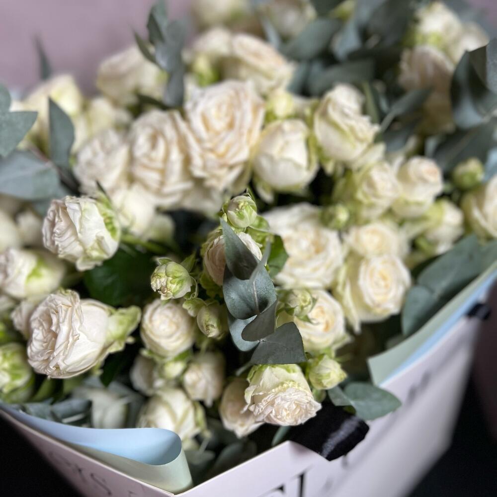 Эвкалипт – 5 шт.Роза кустовая пионовидная – 15 шт.декаротивная упаковка – 3 шт.Атласная лента – 2 шт.