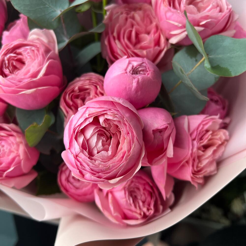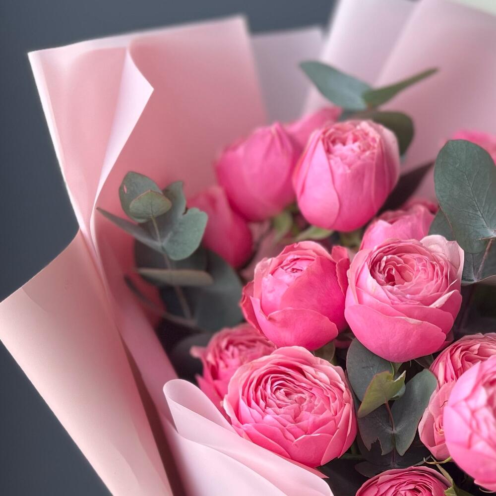 Кустовая пионовидная роза – 5 шт.Эвкалипт – 5 шт.декоративная упаковка – 1 шт.Атласная лента – 1 шт.