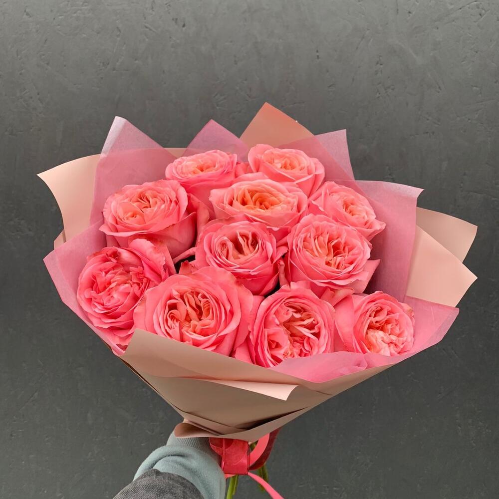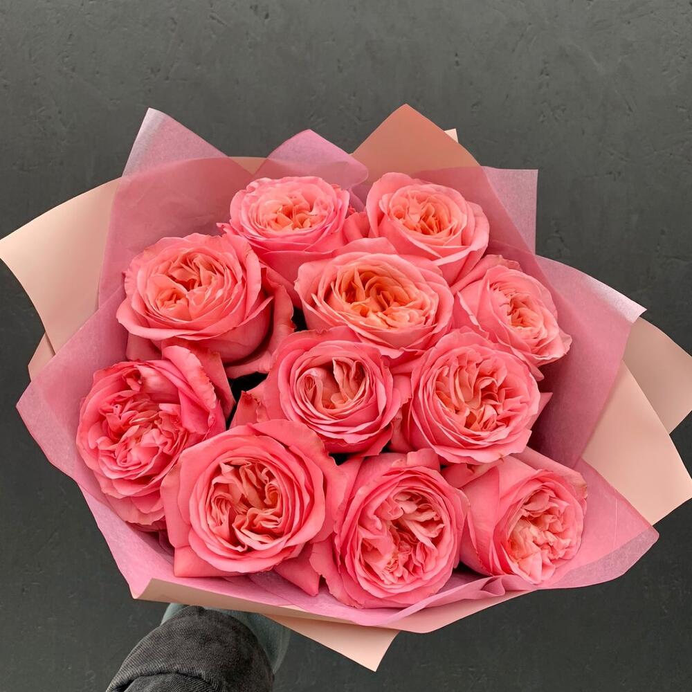 Букет пионовидных роз с кустовыми и эвкалиптом