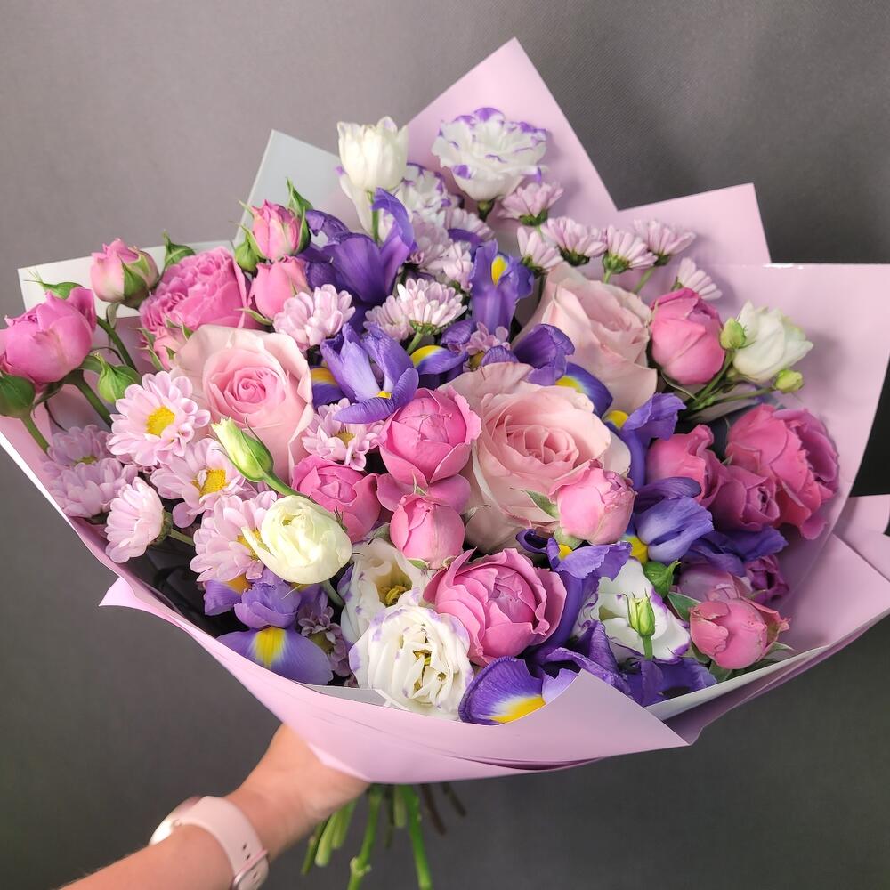 Роза Эквадор – 3 шт.Эустома – 2 шт.Лента атласная – 1 шт.Сантини – 3 шт.Роза кустовая пионовидная – 2 шт.Упаковка дизайнерская – 1 шт.Ирис Blue Magic – 5 шт.