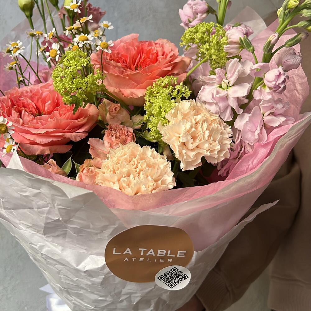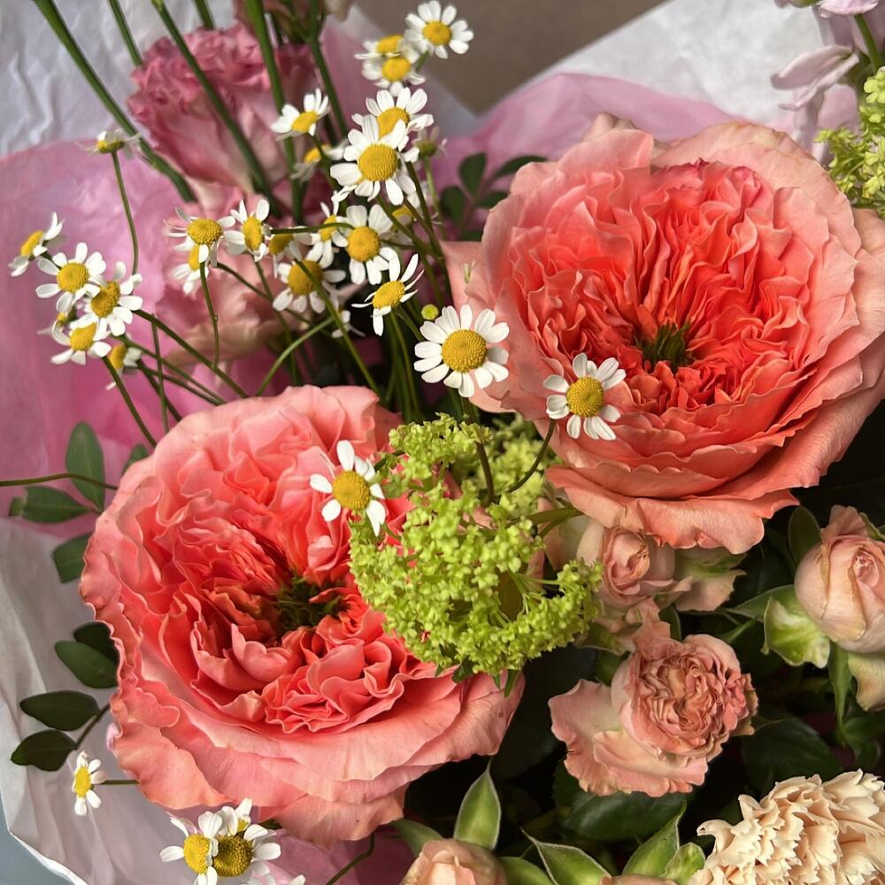 Роза пионовидная – 2 шт.Диантус – 2 шт.Роза кустовая пионовидная – 1 шт.Лизиантус – 1 шт.Маттиола – 2 шт.Матрикария – 1 шт.Упаковка дизайнерская – 1 шт.