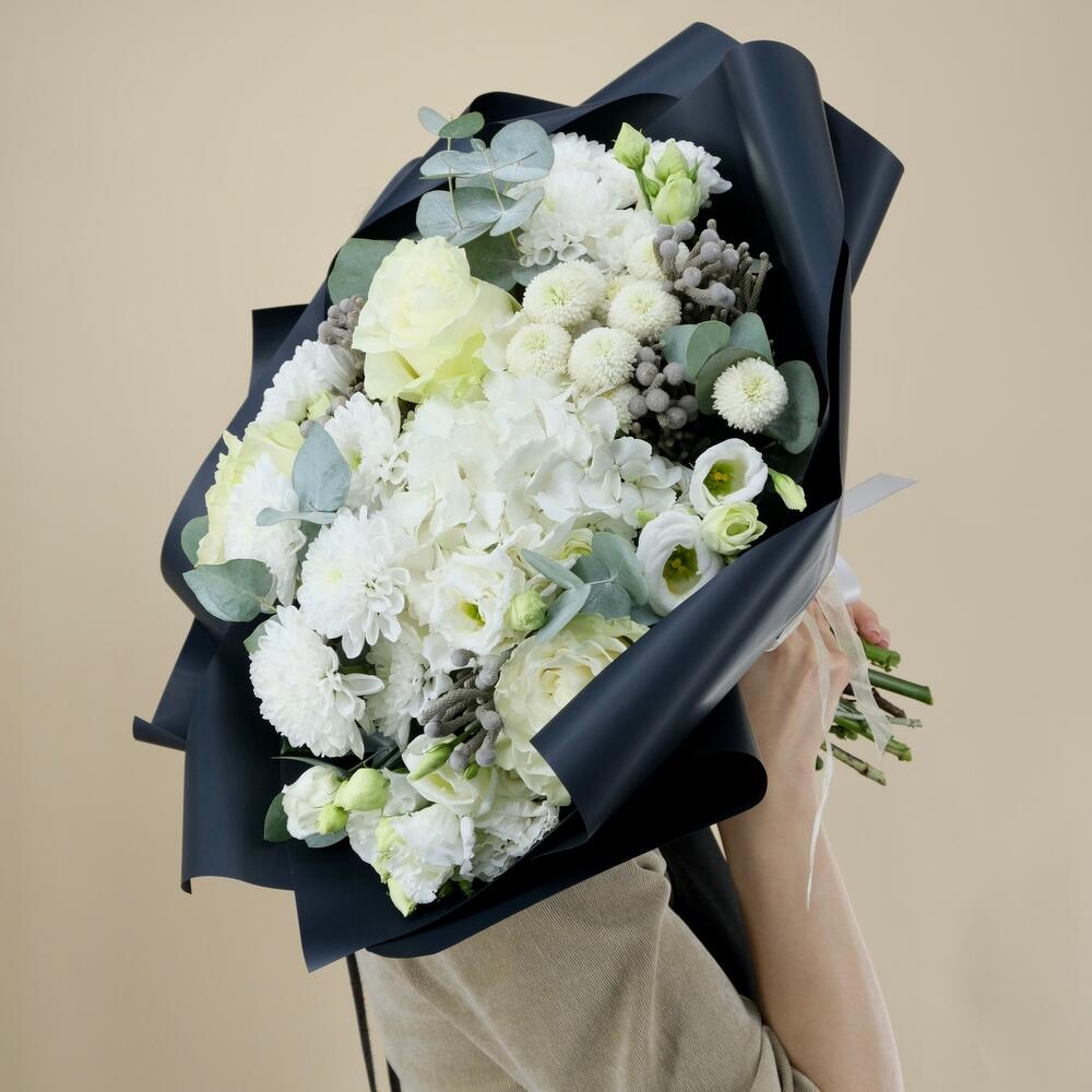 Гортензия – 1 шт.Роза – 1 шт.Бруния – 1 шт.Хризантема кустовая – 4 шт.Лизиантус – 2 шт.Эвкалипт – 1 шт.Упаковка – 1 шт.акваножка – 1 шт.