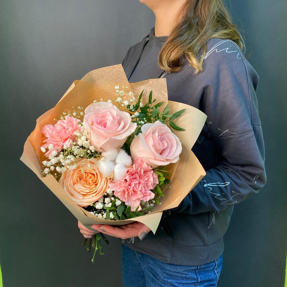 Роза Эквадор – 3 шт.Диантус – 2 шт.Хлопок – 1 шт.Гипсофила – 2 шт.Зелень – 3 шт.Упаковка дизайнерская – 3 шт.Лента атласная – 1 шт.
