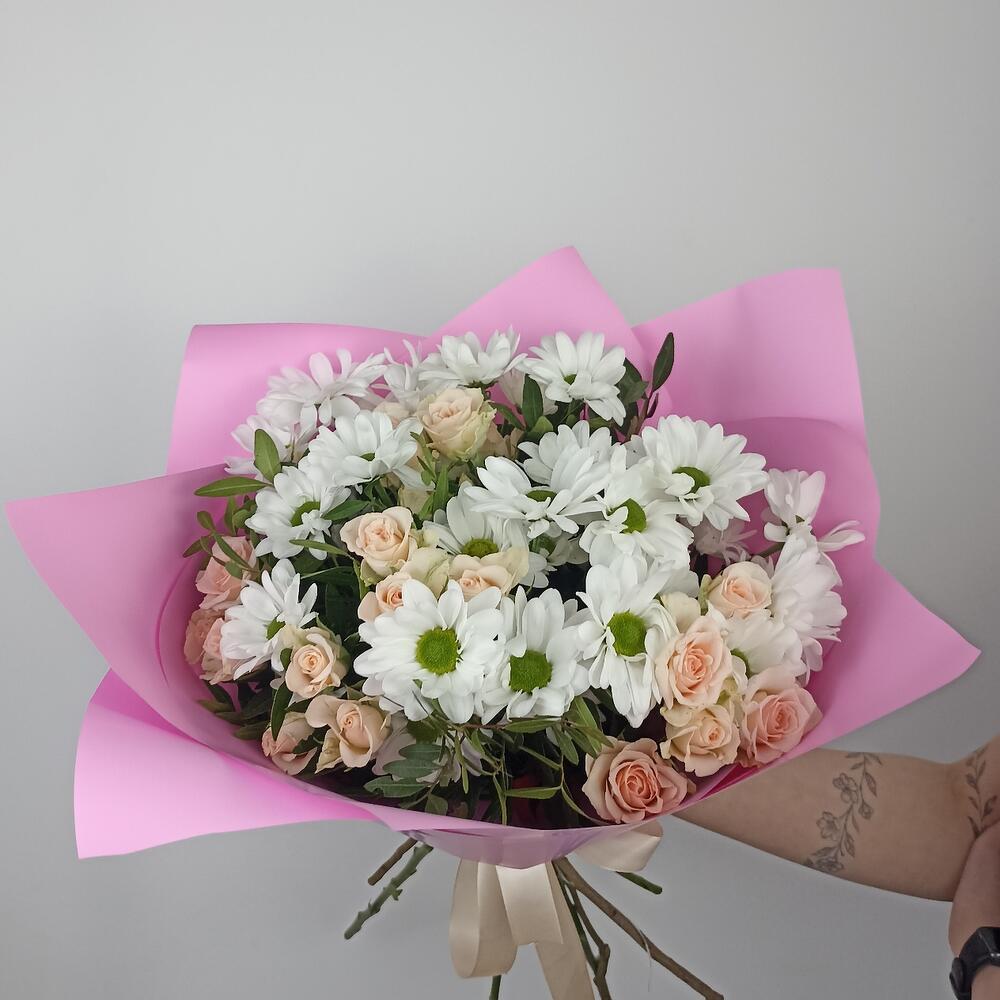 Букет с хризантемами и кустовыми розами