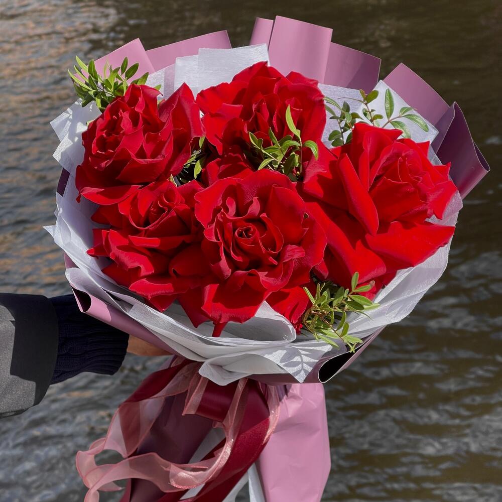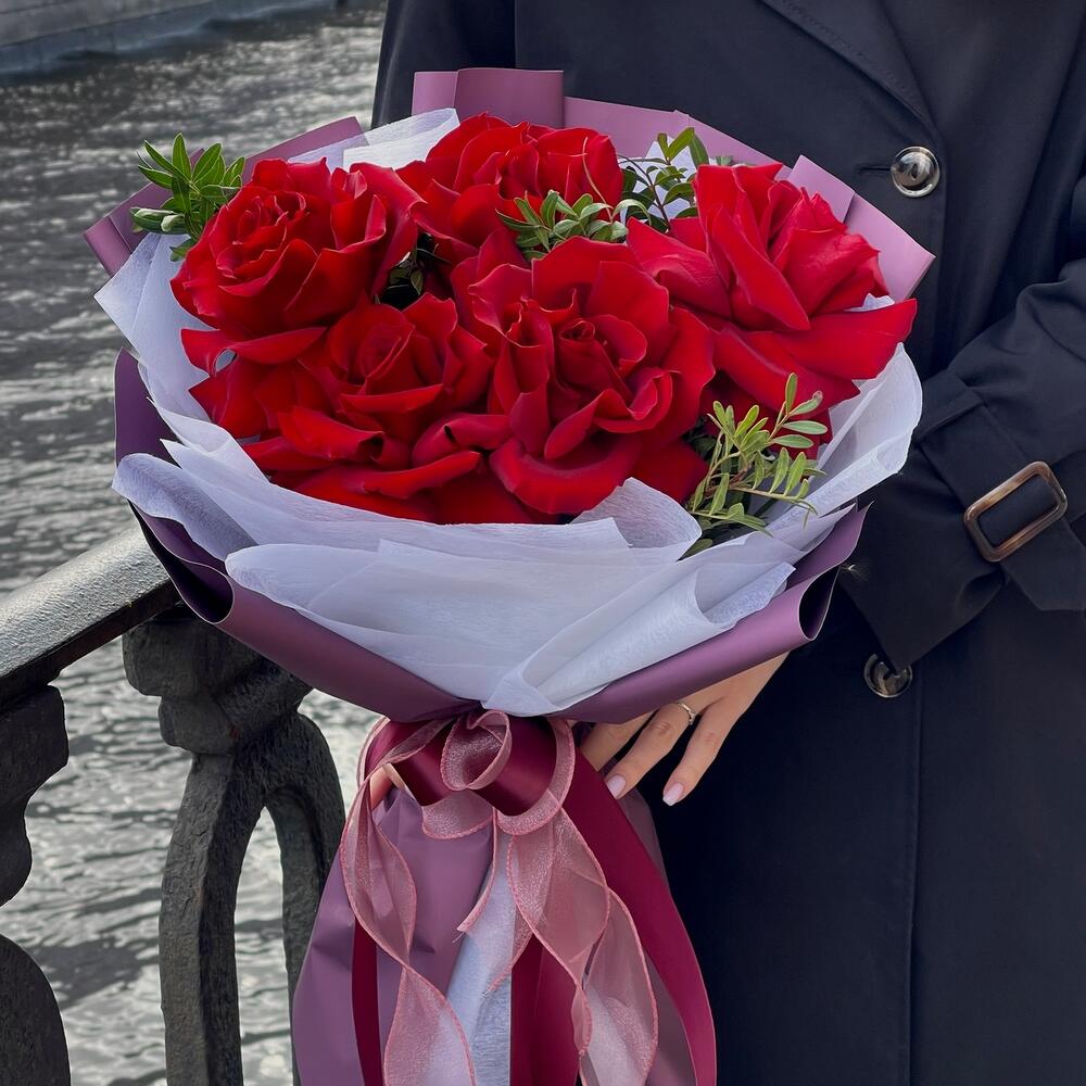 Лента – 2 шт.Роза одноголовая – 5 шт.Фисташка – 5 шт.Упаковка дизайнерская – 1 шт.