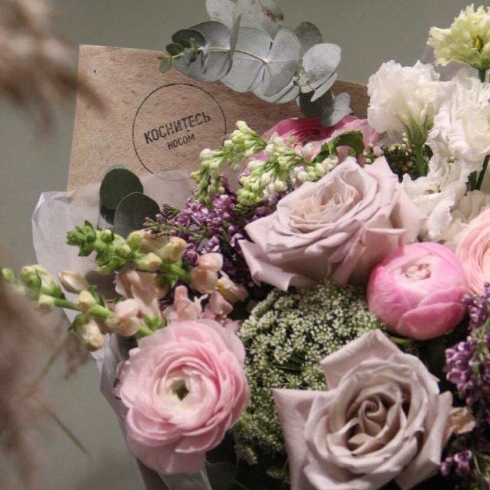 Пион – 3 шт.Сирень – 5 шт.Ранункулюс – 5 шт.Роза сортовая – 5 шт.Лизиантус – 5 шт.Львиный зев – 3 шт.зонтик садовый – 4 шт.Эвкалипт – 7 шт.Упаковка – 1 шт.Лента – 1 шт.