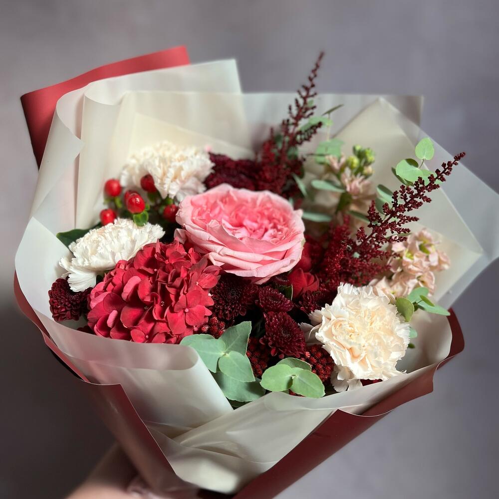 Букет с гортензией и пионовидной розой