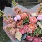 Букет с пионовидной розой, матиолой и гвоздикой