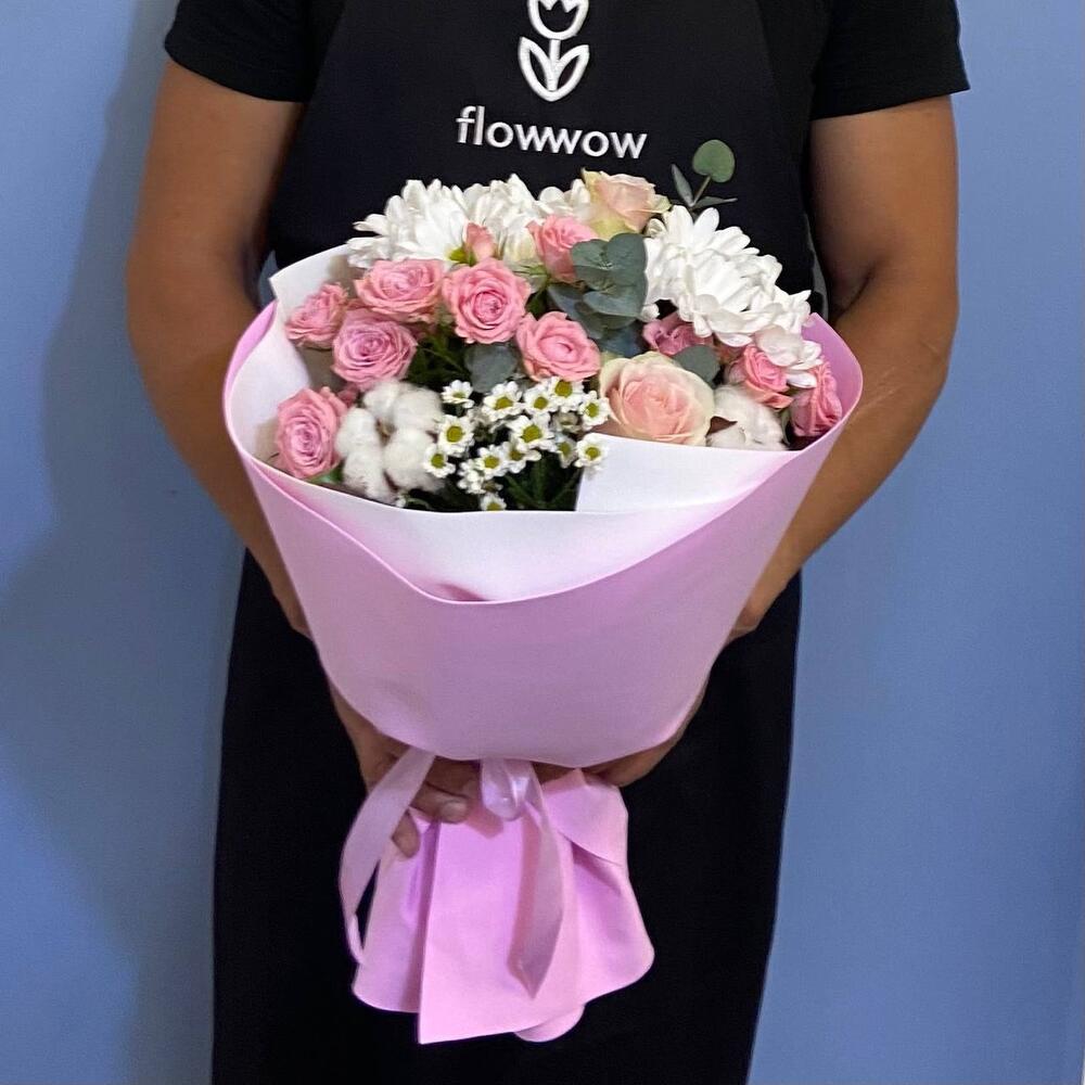 Хлопок – 2 шт.Эвкалипт – 1 шт.Лента атласная – 1 шт.Роза кустовая розовая – 3 шт.Сантини – 1 шт.Упаковка дизайнерская – 1 шт.Роза Эквадор Премиум – 2 шт.Бакарди – 2 шт.