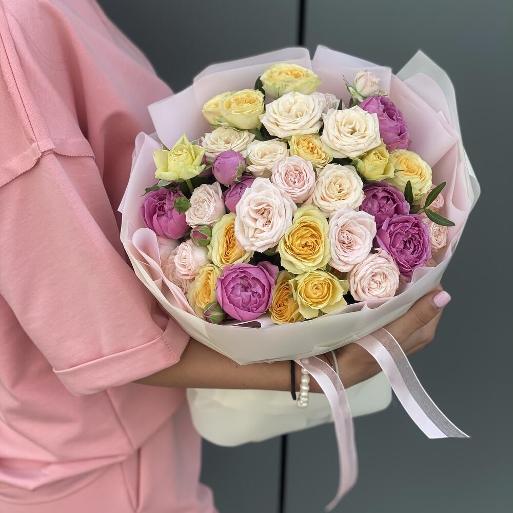 Букет Юбилейный из кустовых пионовидных роз и хризантемы