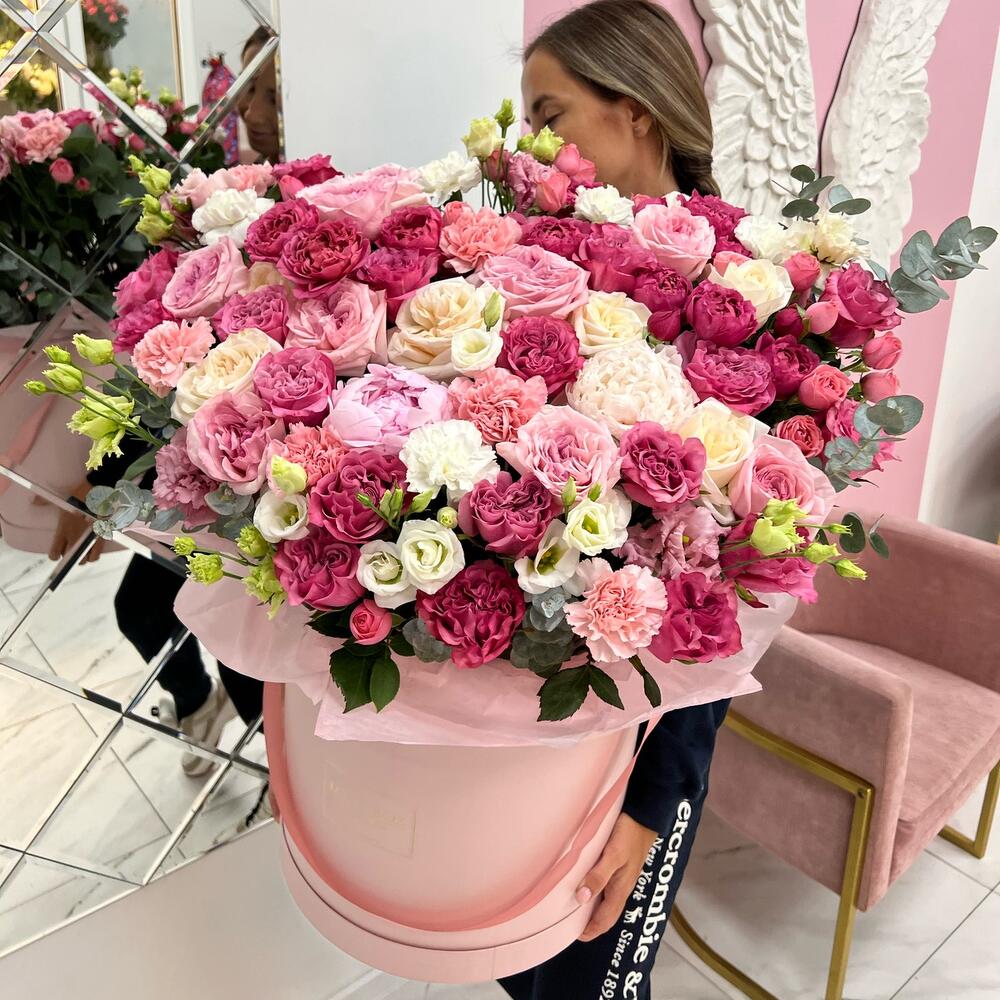 Роза пионовидная – 39 шт.Лизиантус – 12 шт.Пион – 4 шт.Диантус – 9 шт.Кустовая роза – 12 шт.Эвкалипт – 5 шт.Шляпная коробка – 1 шт.
