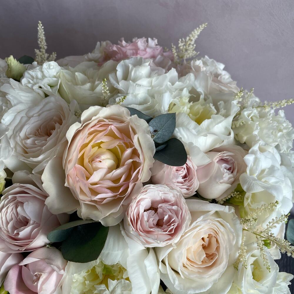 Альстромерии, Гвоздики, Кустовые розы, Лизиантусы, Розы, Хризантемы