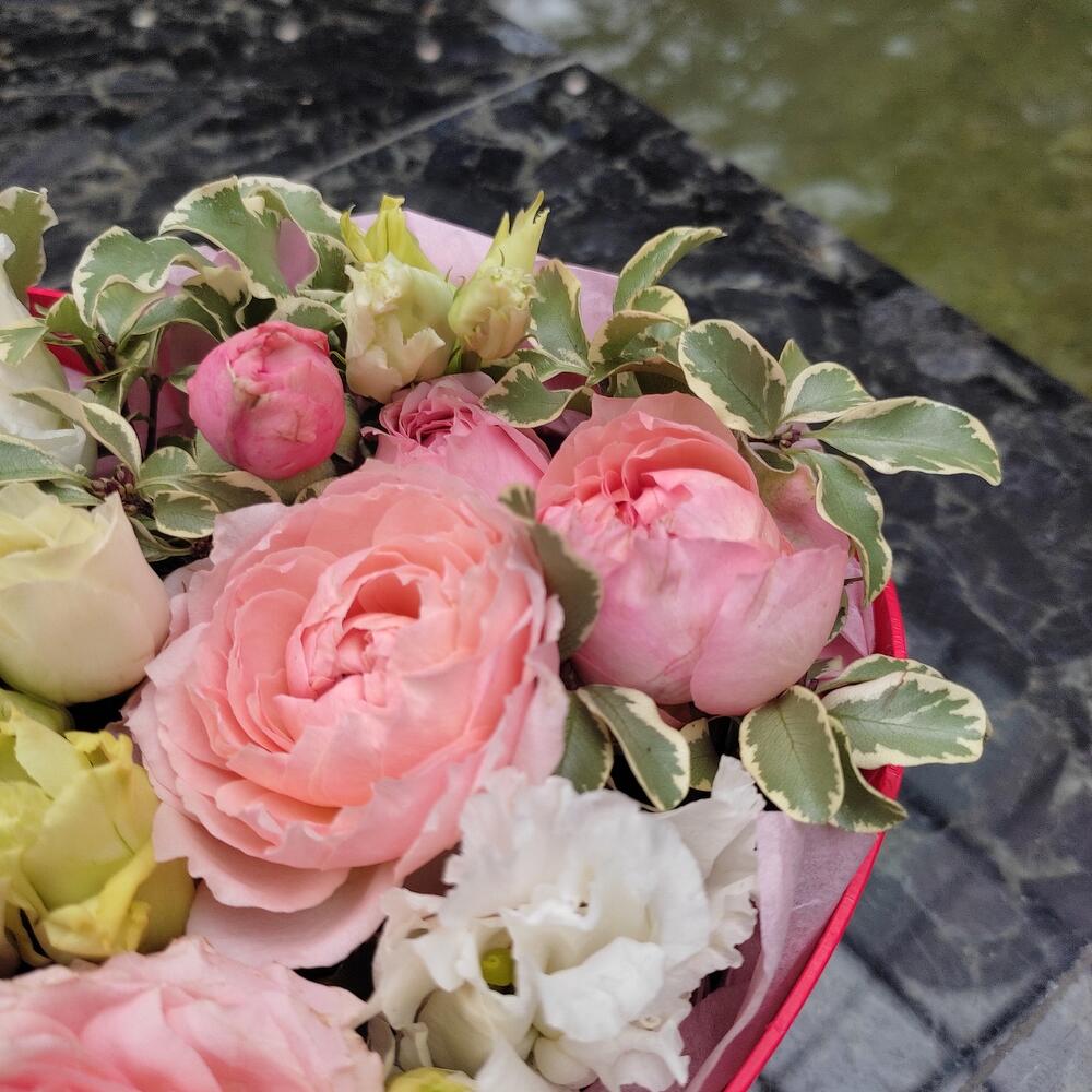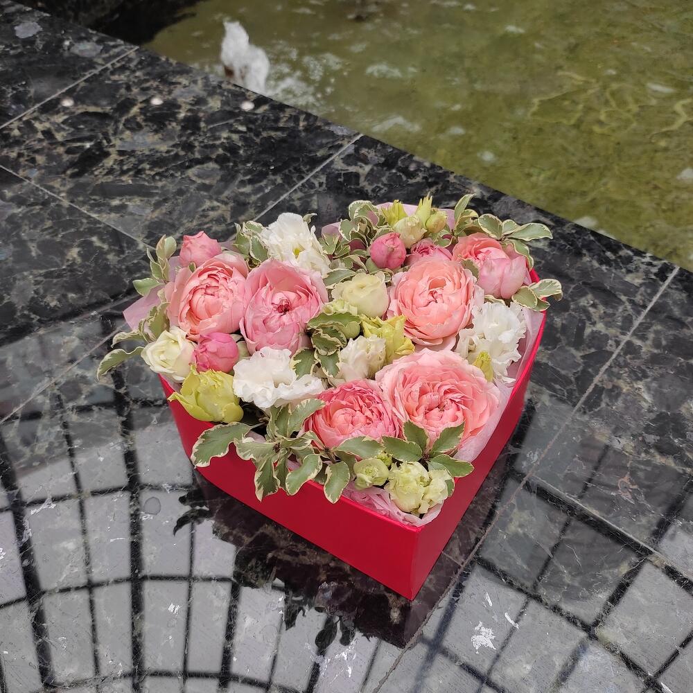 Роза кустовая пионовидная – 2 шт.Питтоспорум – 2 шт.Лизиантус – 3 шт.Коробка сердце – 1 шт.