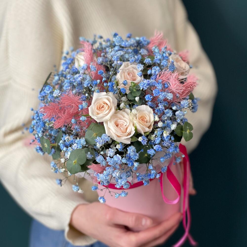Цветочная композиция в шляпной коробке с голубой гипсофилой "Майолика"