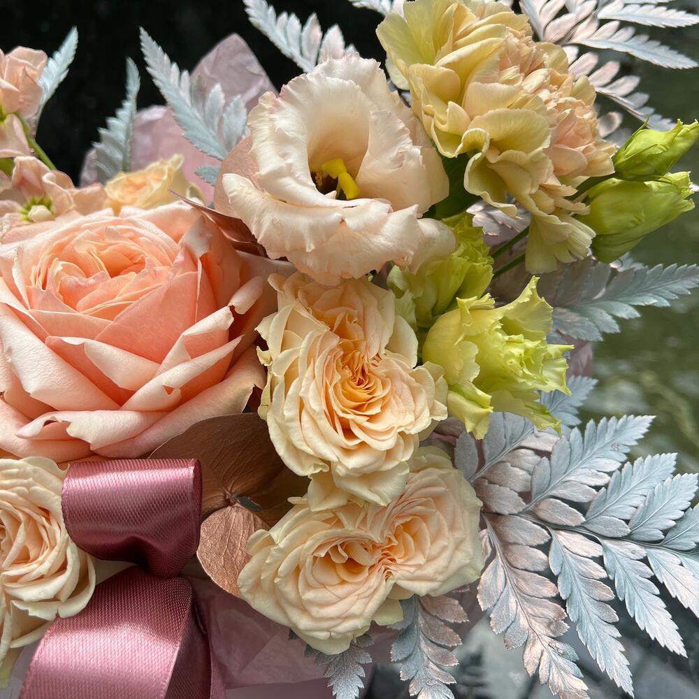 Роза – 1 шт.Роза кустовая – 1 шт.Лизиантус – 1 шт.Диантус – 2 шт.Маттиола – 1 шт.Эвкалипт – 1 шт.Папоротник – 3 шт.Лента – 2 шт.Коробка шляпная – 1 шт.