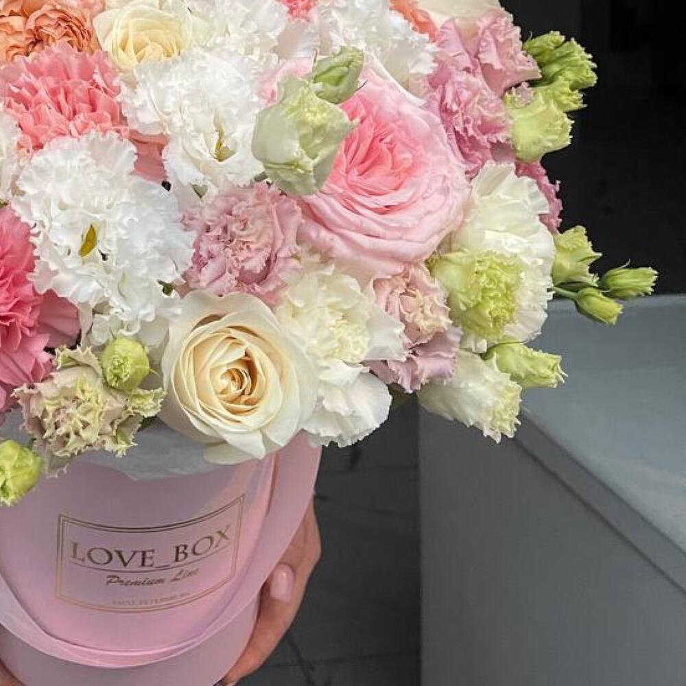Роза Эквадор – 7 шт.Роза пионовидная – 3 шт.Роза кустовая – 2 шт.Лизиантус – 7 шт.Шляпная коробка – 1 шт.