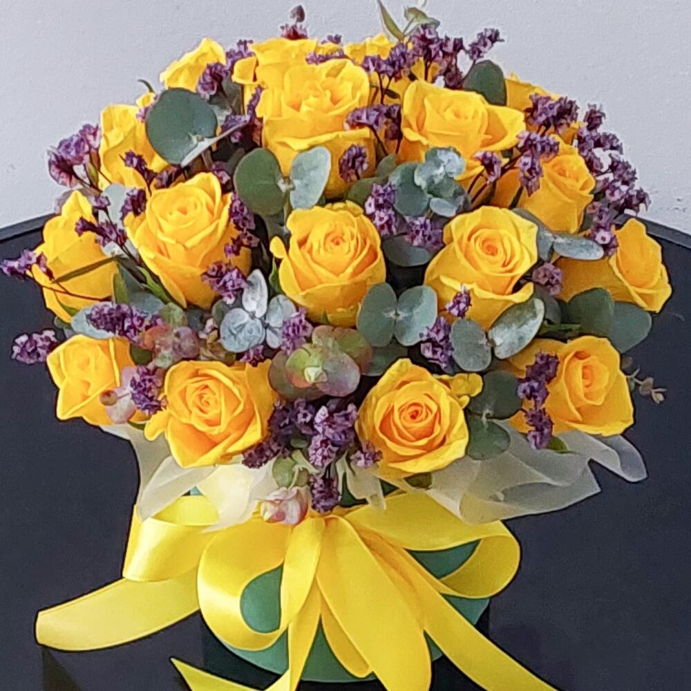 Классическая композиция в шляпной коробке из 21 яркой жёлтой розы, эвкалипта и стабилизированного лимониума