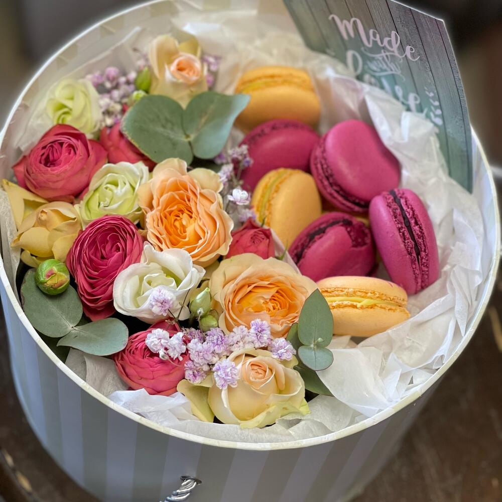 Коробка шляпная с цветами и сладостями.