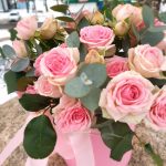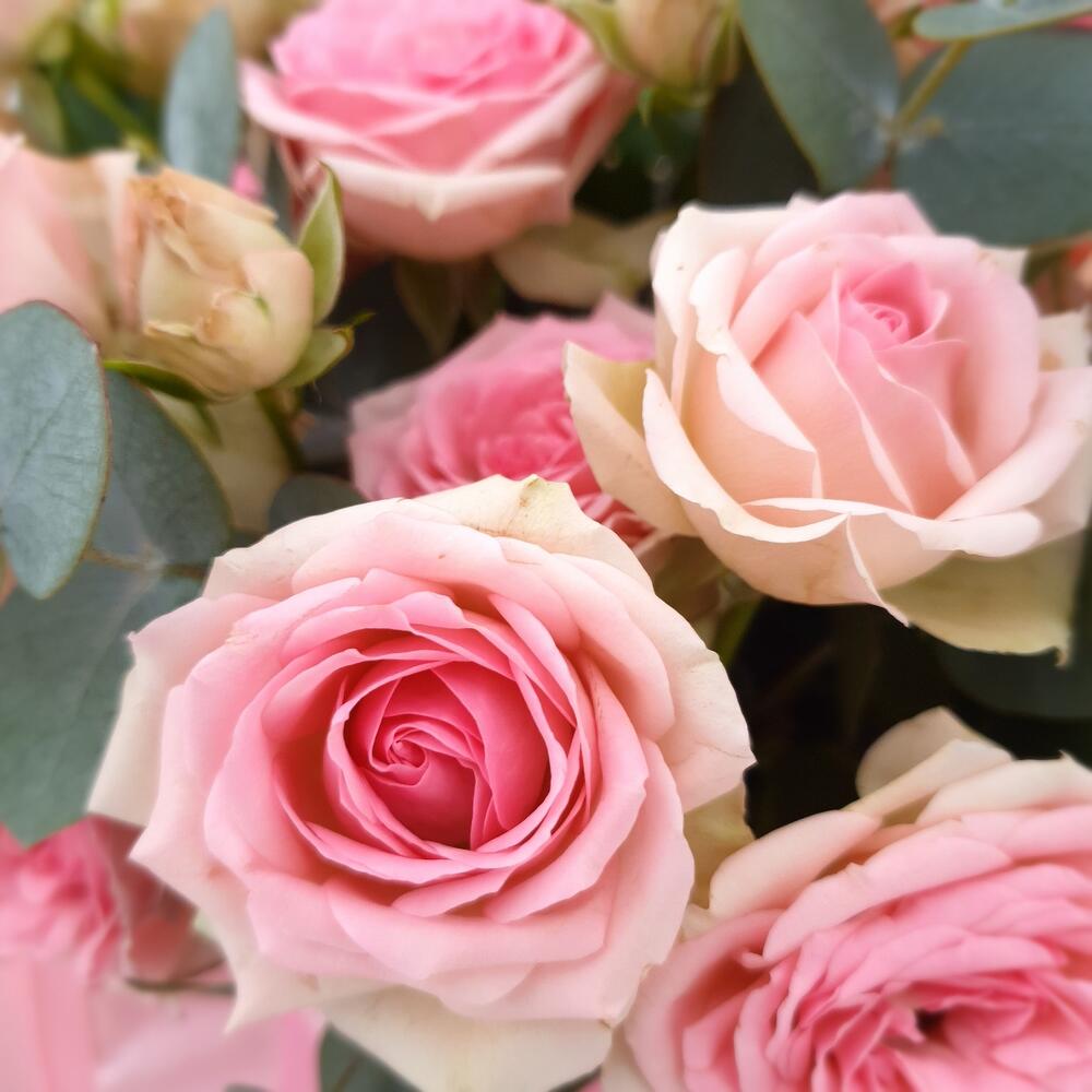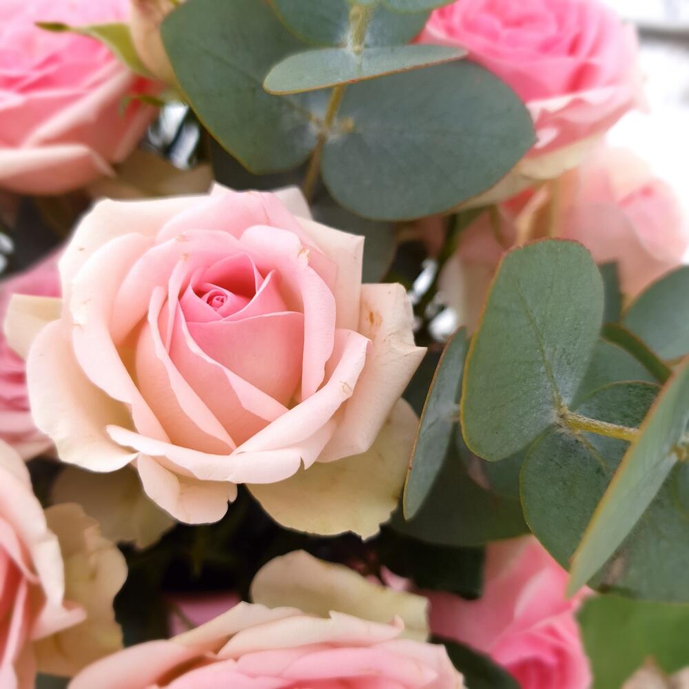 Нежная, романтичная композиция для самых нежных. С пионовидной кустовой розочкой и ароматным эвкалиптом