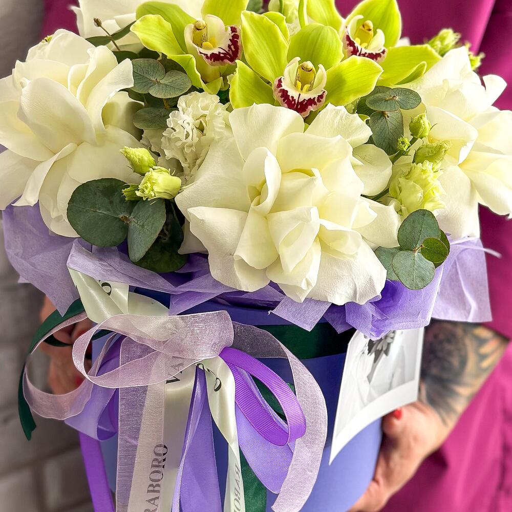 Воздушная,такая кружевная композиция в шляпной коробке с белоснежными французскими розами,долгоиграющими орхидеями,махровым лизиантусом и эвкалиптом порадует Вас стойкостью,можете в этом не сомневаться)Цветы стоят в специальной флористической губке ,что позволяет им больше оставаться свежими и радовать получателя.Так же композиция в коробке это очень удобно и эффектно!Добавляйте товар и магазин в избранное,чтобы было легче нас найти с Уважением VaraBoro flowers