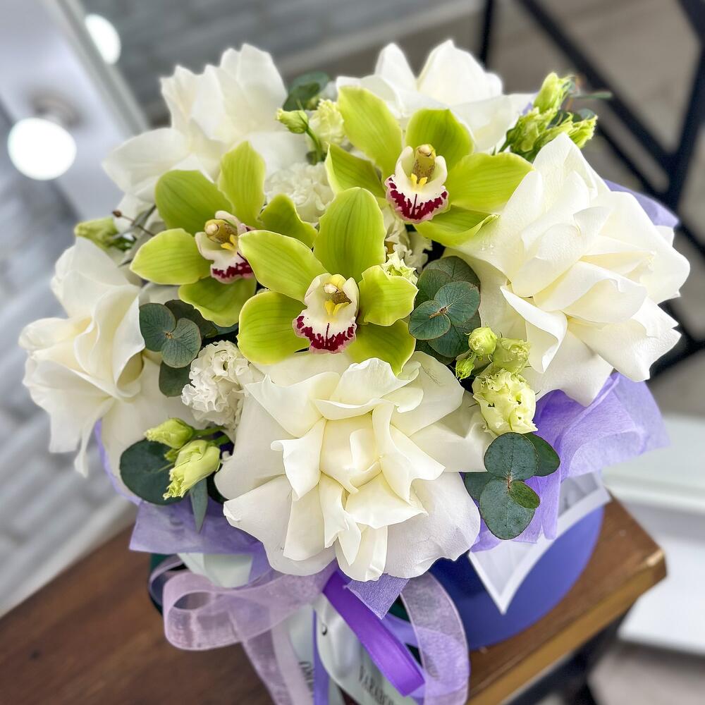 Орхидея Цимбидиум – 3 шт.Эвкалипт – 1 шт.Лизиантус махровый – 3 шт.Открыточка с вашими пожеланиями – 1 шт.роза плая бланка – 5 шт.шляпная коробка с лентами и оазисом – 1 шт.