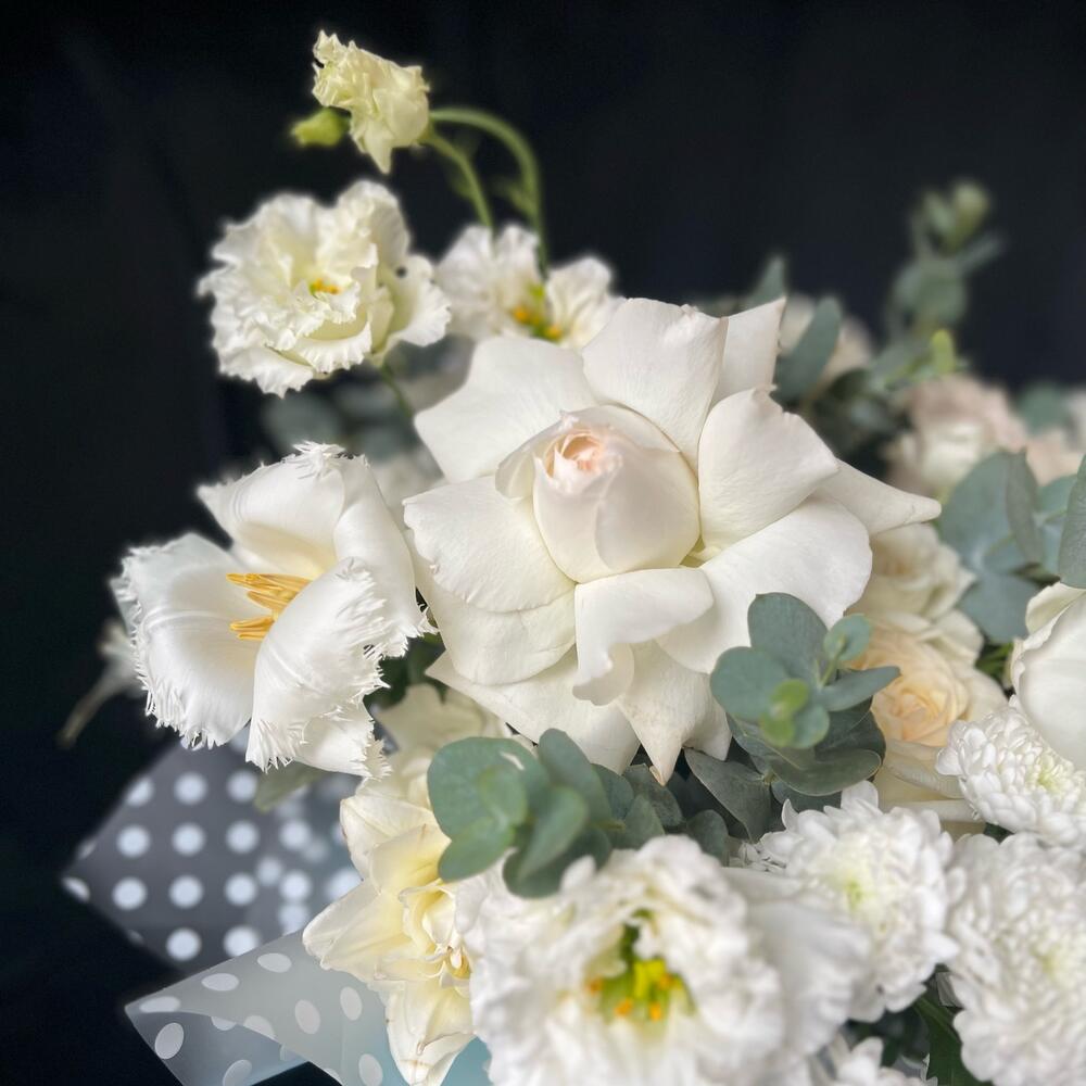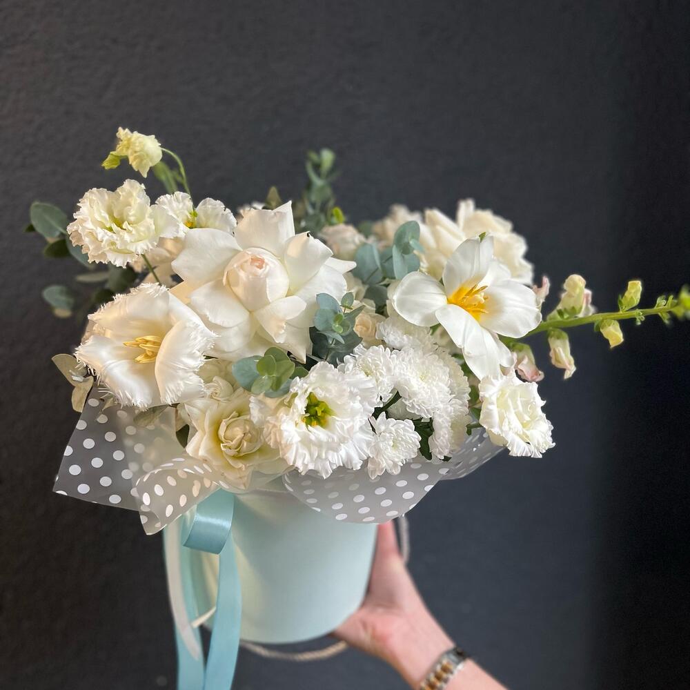 Роза одноголовая – 5 шт.Тюльпан – 3 шт.Кустовая роза – 3 шт.Хризантема кустовая – 4 шт.Эустома – 4 шт.антиринум – 2 шт.Эвкалипт – 3 шт.Коробка шляпная – 1 шт.Флористическая губка (оазис) – 1 шт.Атласная лента – 1 шт.