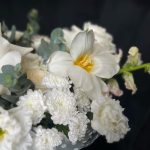 Цветы в коробке с нарциссами , ромашками и лагурусом