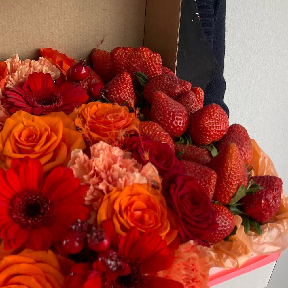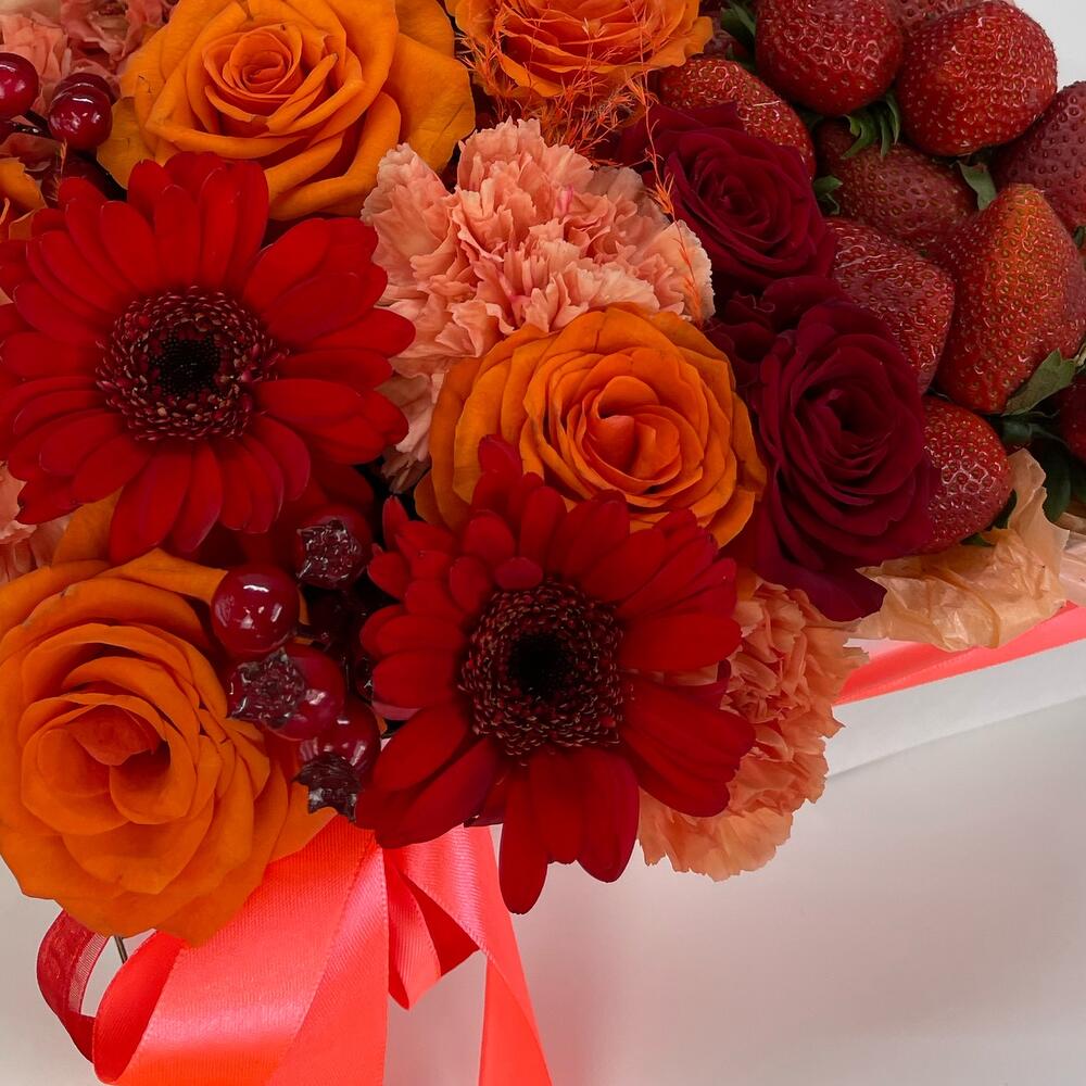 Клубника – 1500 гр.Гербера – 3 шт.Ягоды декоративные – 3 шт.Роза – 11 шт.Диантус – 6 шт.Коробка шляпная – 1 шт.Оазис флористический – 1 шт.