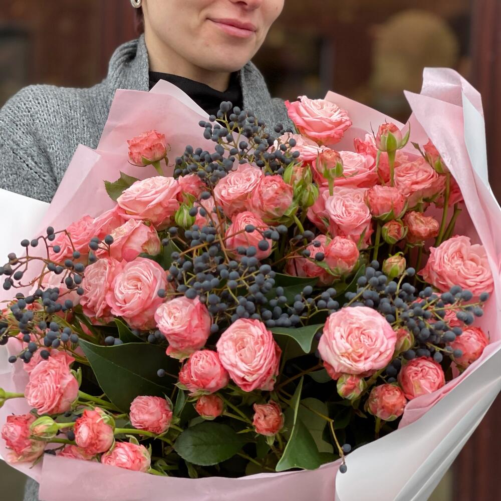 Кустовая пионовидная роза Бомбастик – 7 шт.лигуструм – 2 шт.Авторская упаковка – 1 шт.
