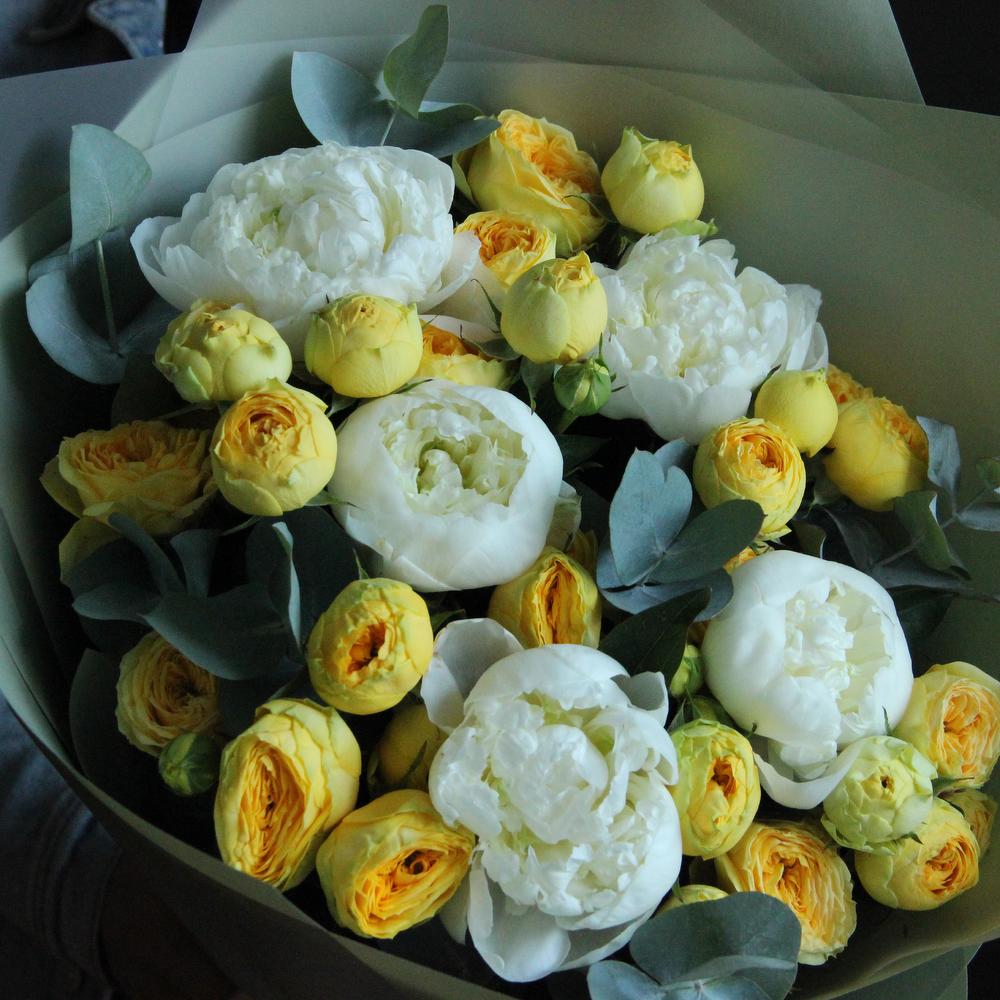 Пион белый – 5 шт.Пионовидная кустовая роза – 5 шт.Эвкалипт – 7 шт.Упаковка – 2 шт.Лента атласная – 2 шт.Открытка – 1 шт.