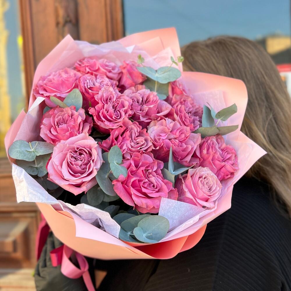Эвкалипт – 3 шт.Лента атласная – 2 шт.Тишью – 3 шт.Пленка матовая – 3 шт.роза пионовидная кантри блю – 15 шт.