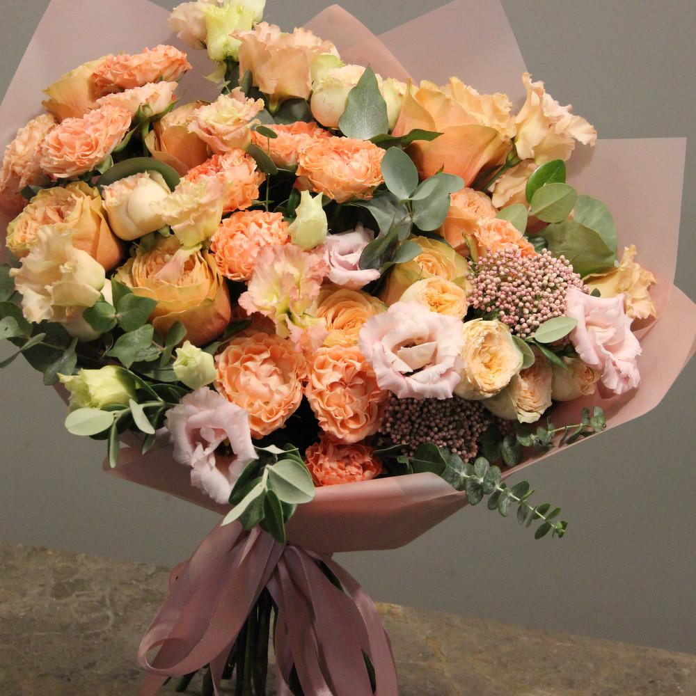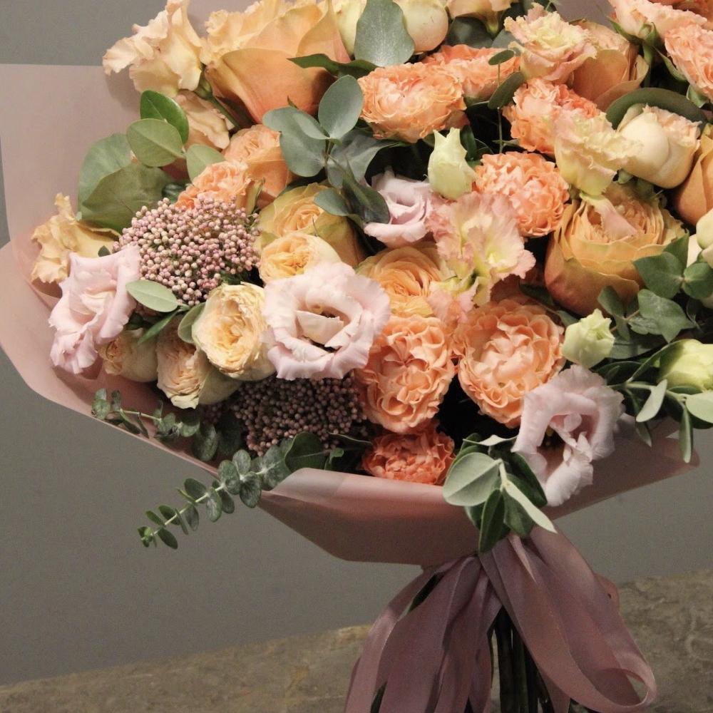Роза кустовая пионовидная – 3 шт.Лизиантус – 3 шт.Роза пионовидная – 7 шт.Эвкалипт – 7 шт.Озотамнус – 2 шт.Упаковка дизайнерская – 2 шт.Лента атласная – 2 шт.